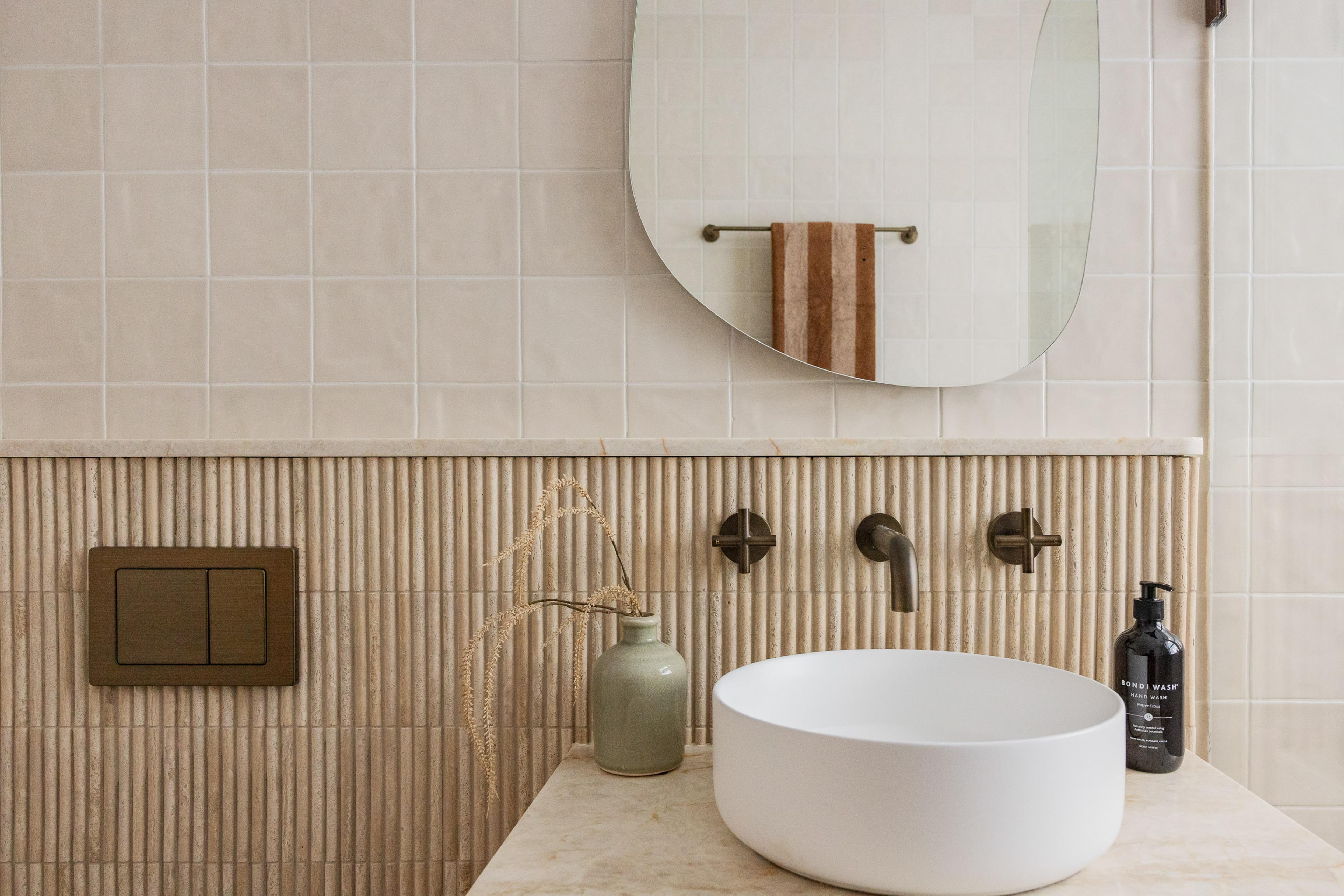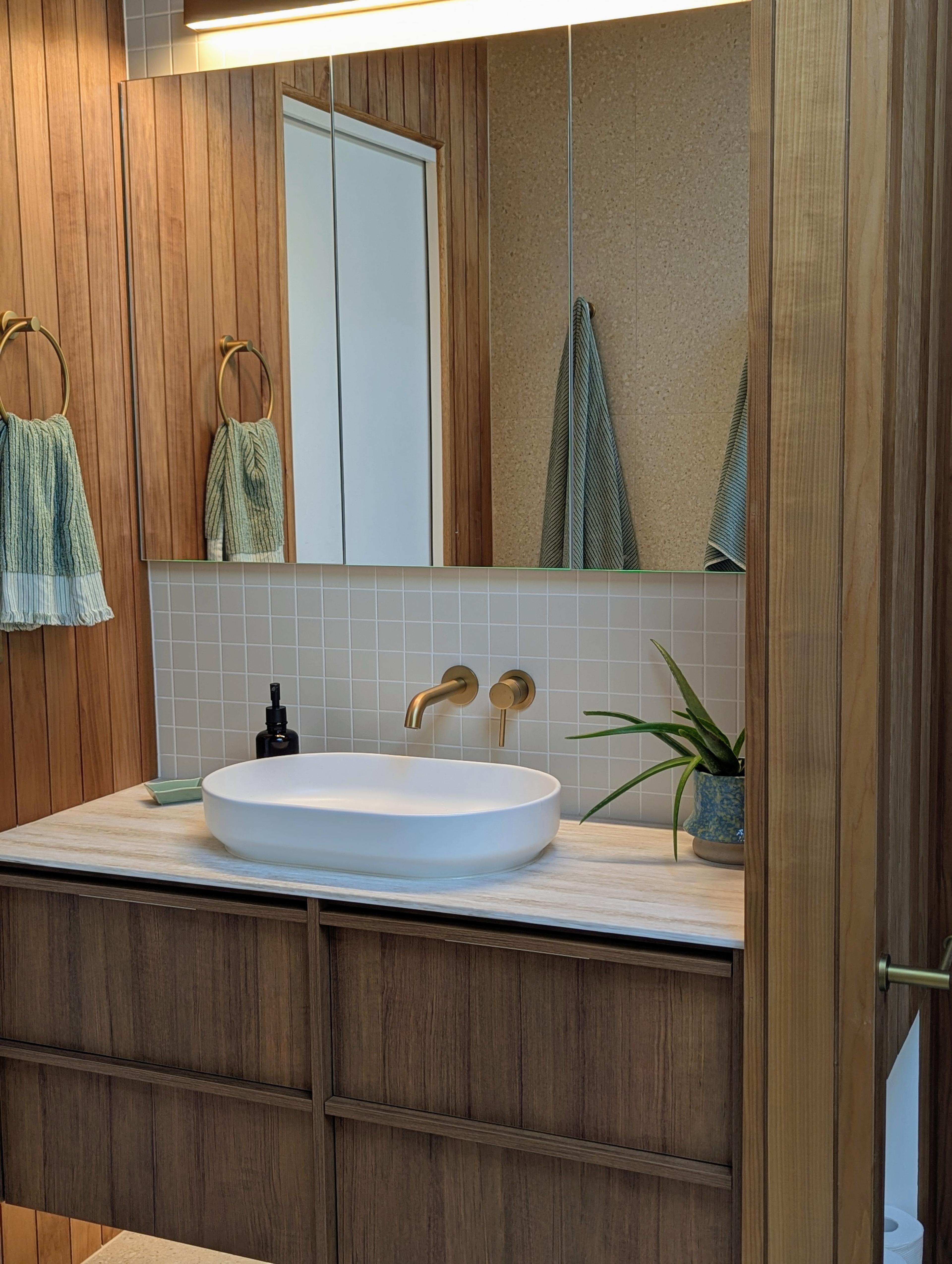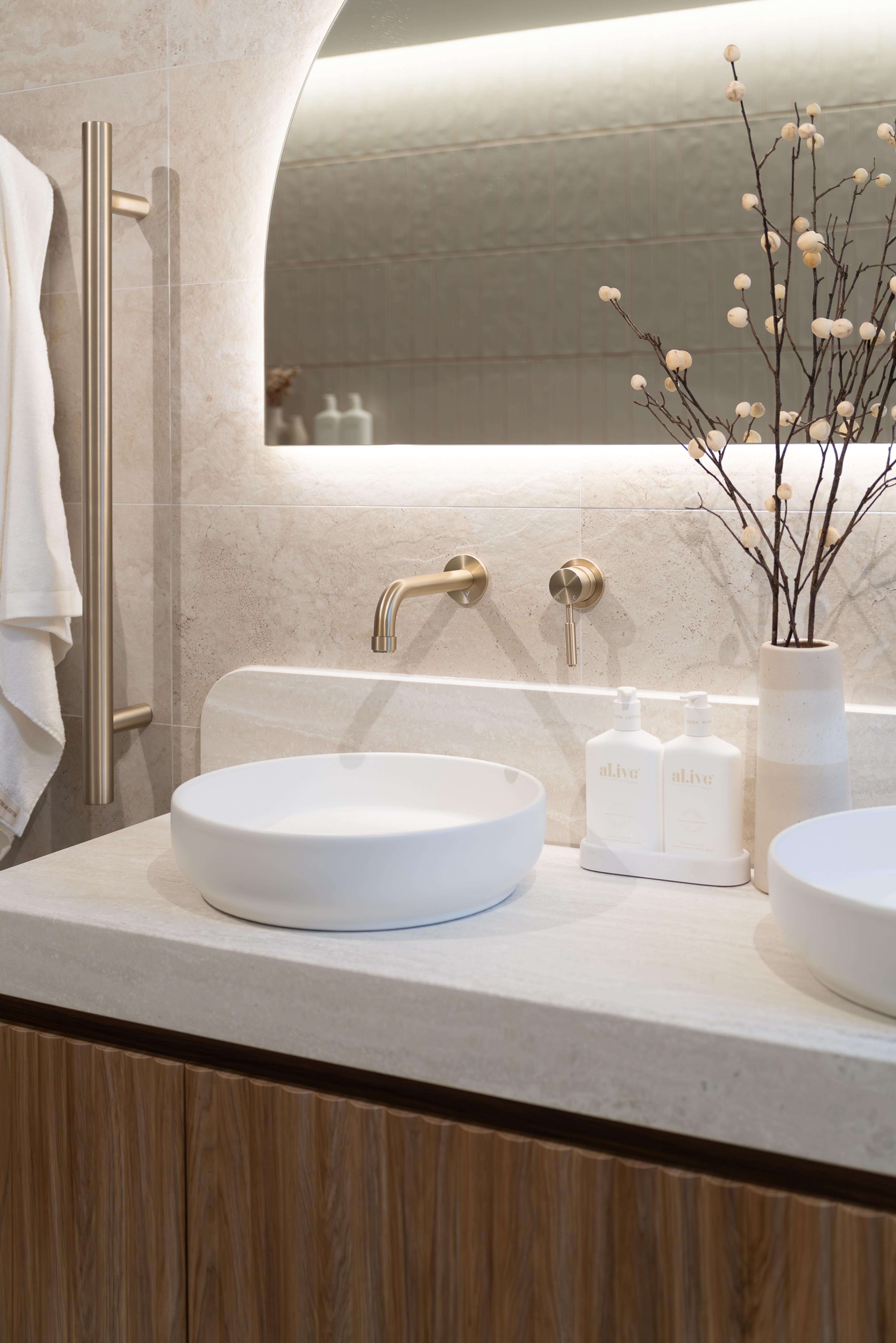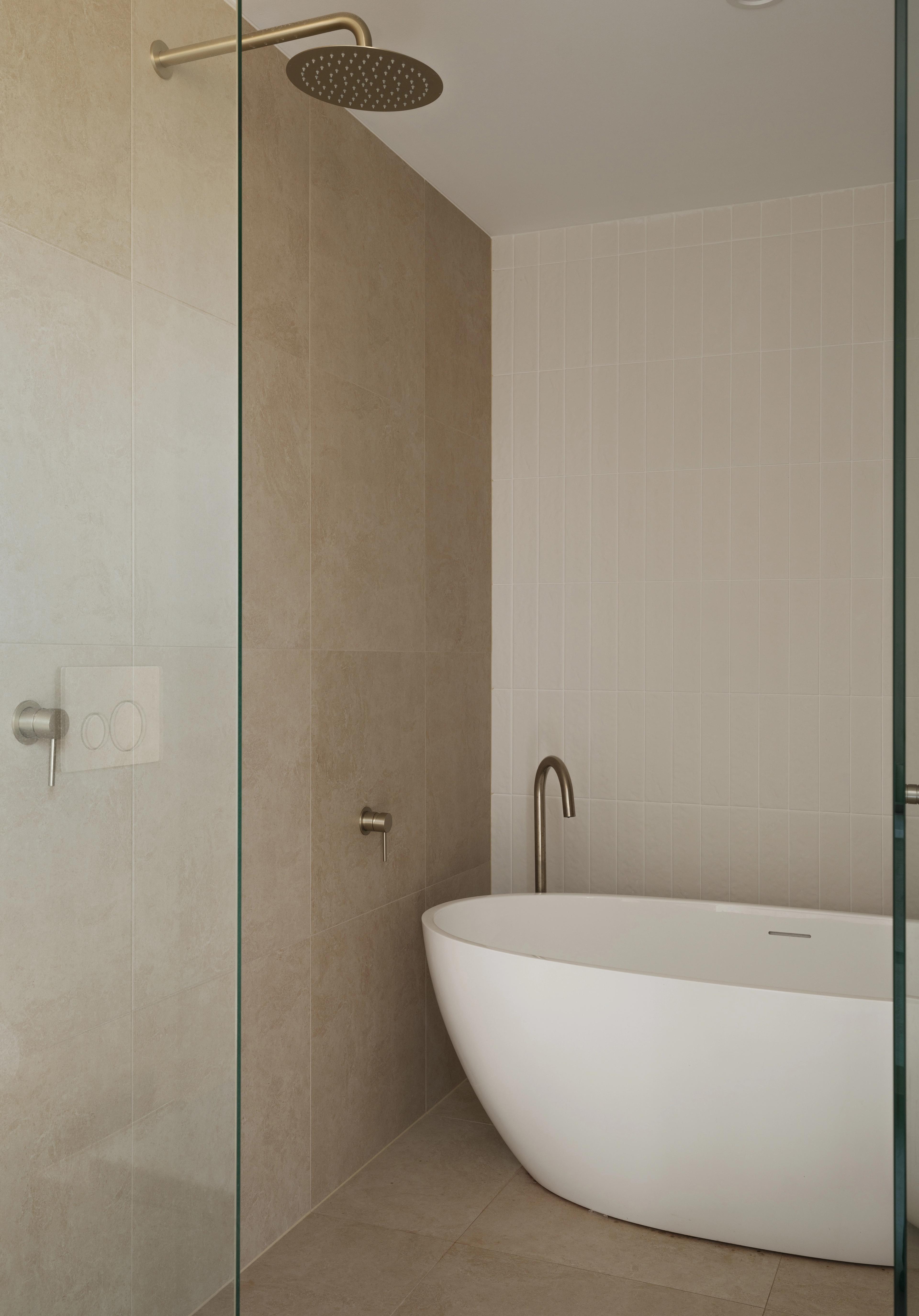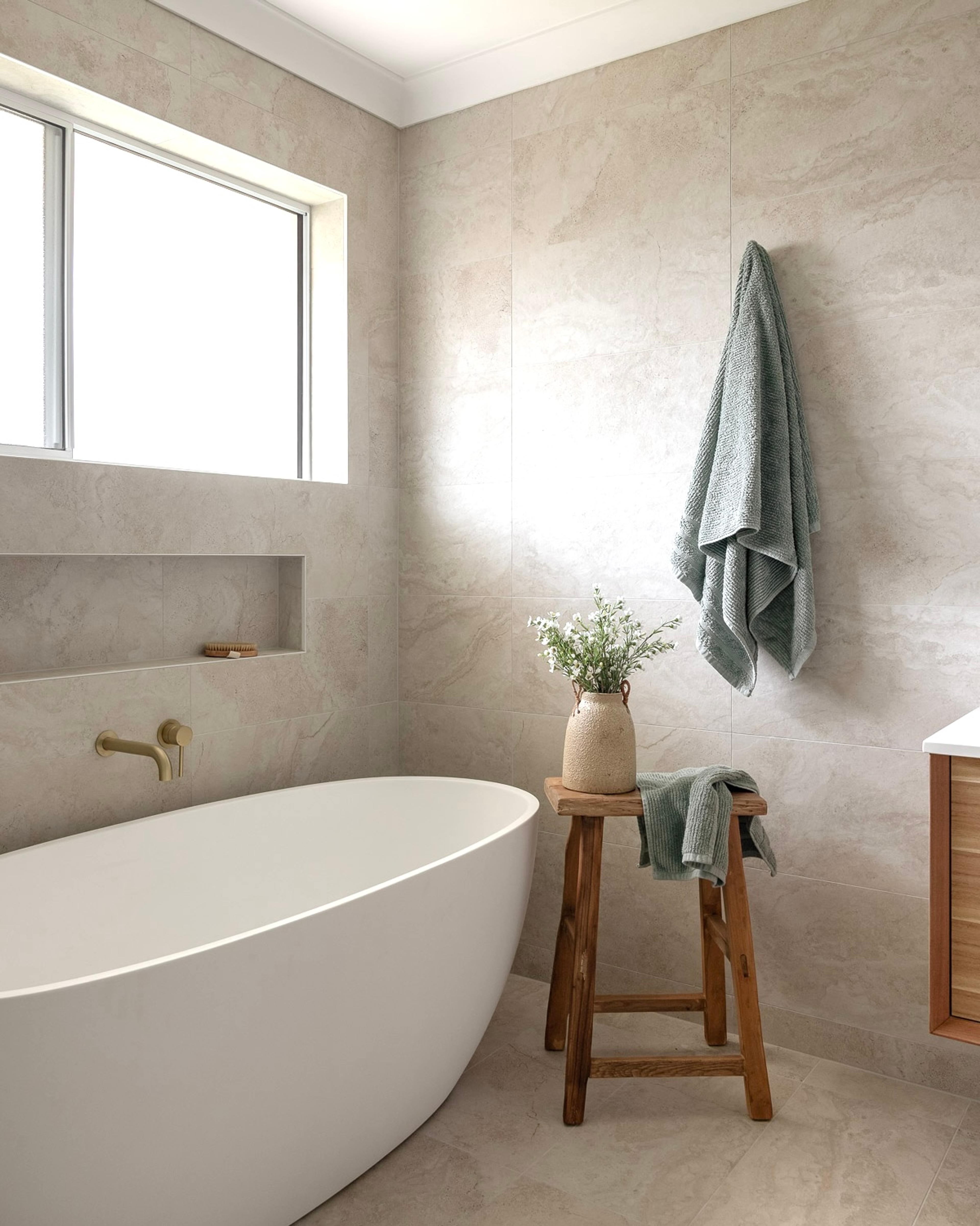 Juliana from @themounthaus has created a space that’s soft and layered, all while mixing textures across tiles, timber and tapware. When it comes to mixing tiles, this is your blueprint: tonal variation, finish contrast and clean lines.