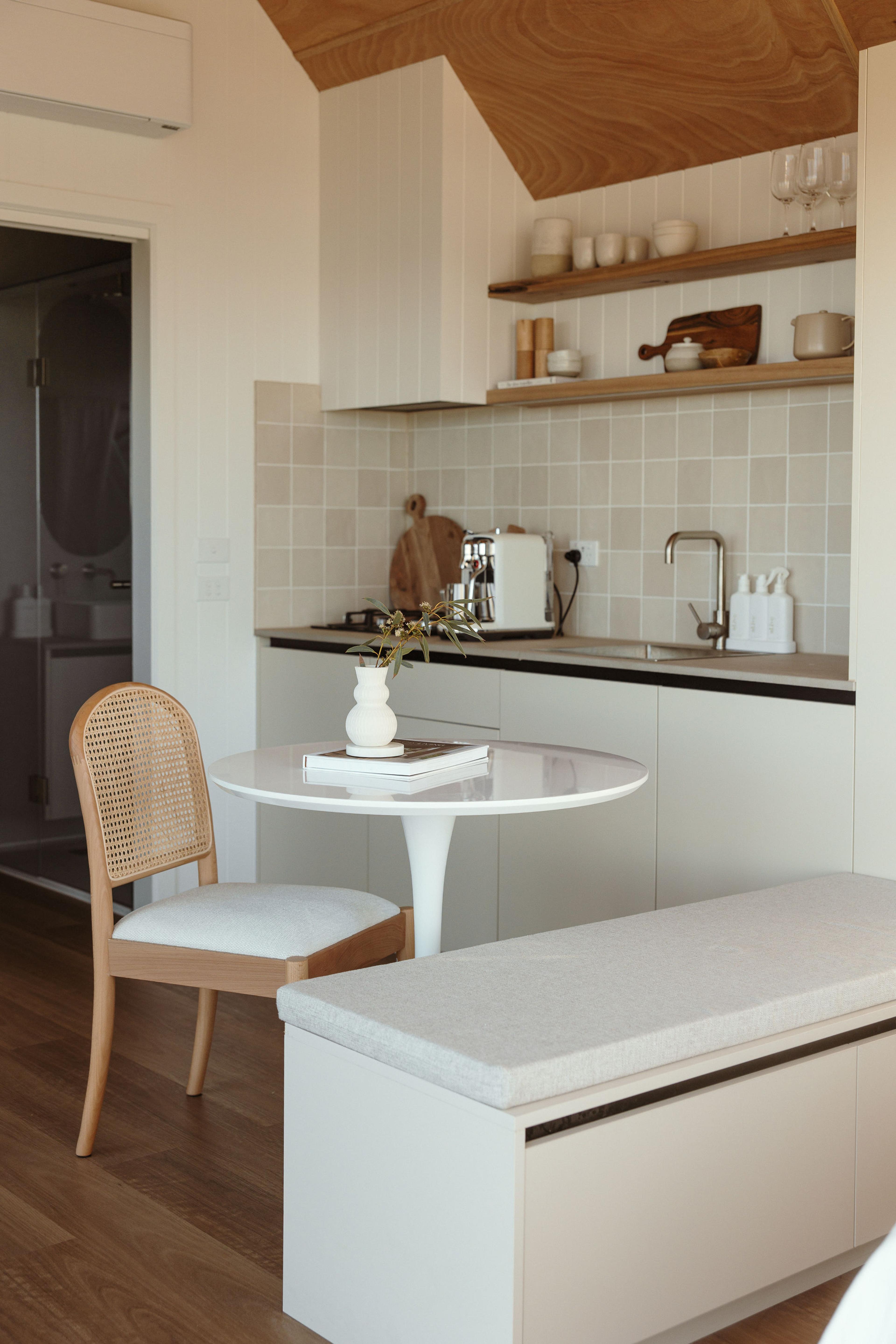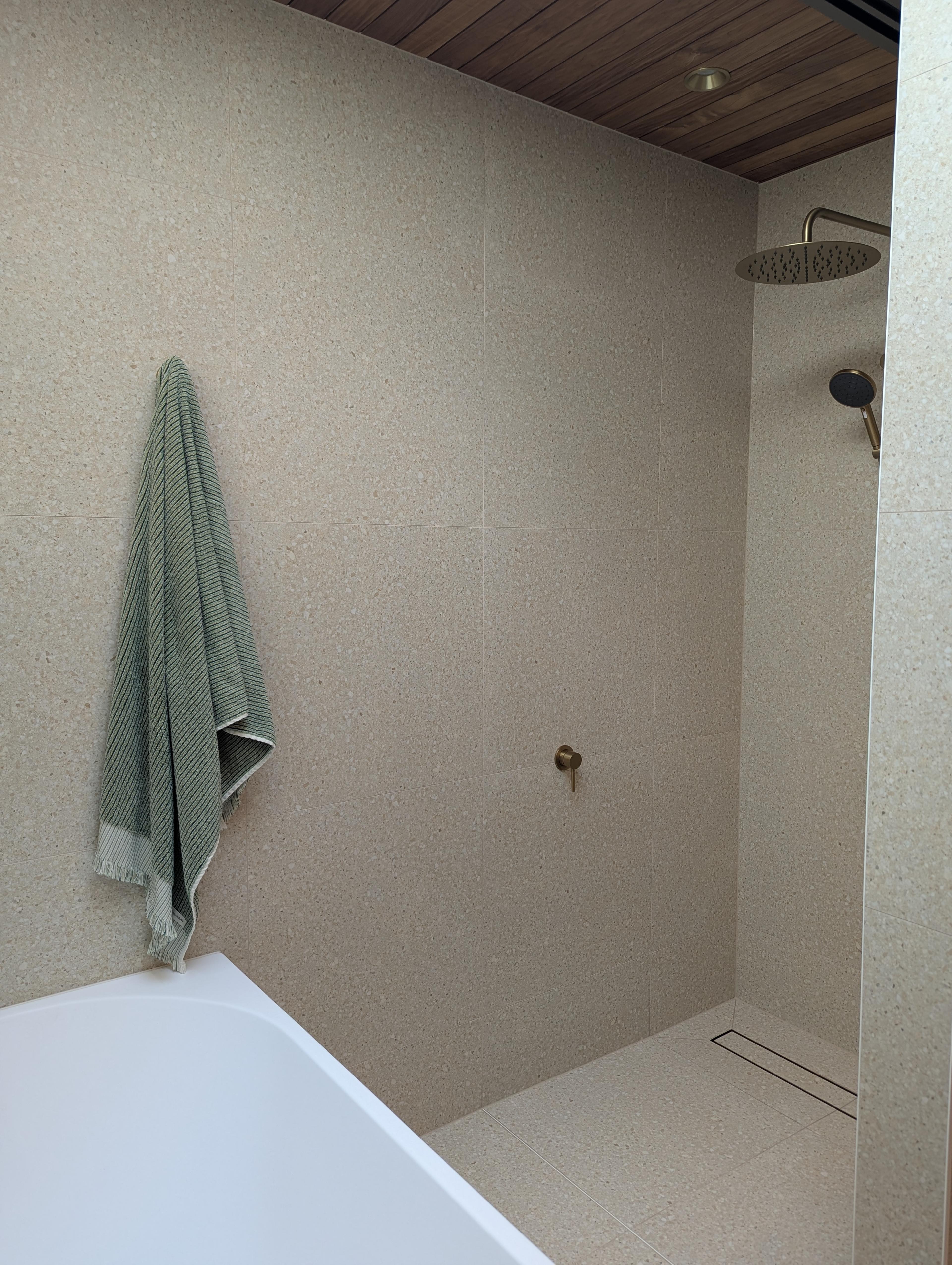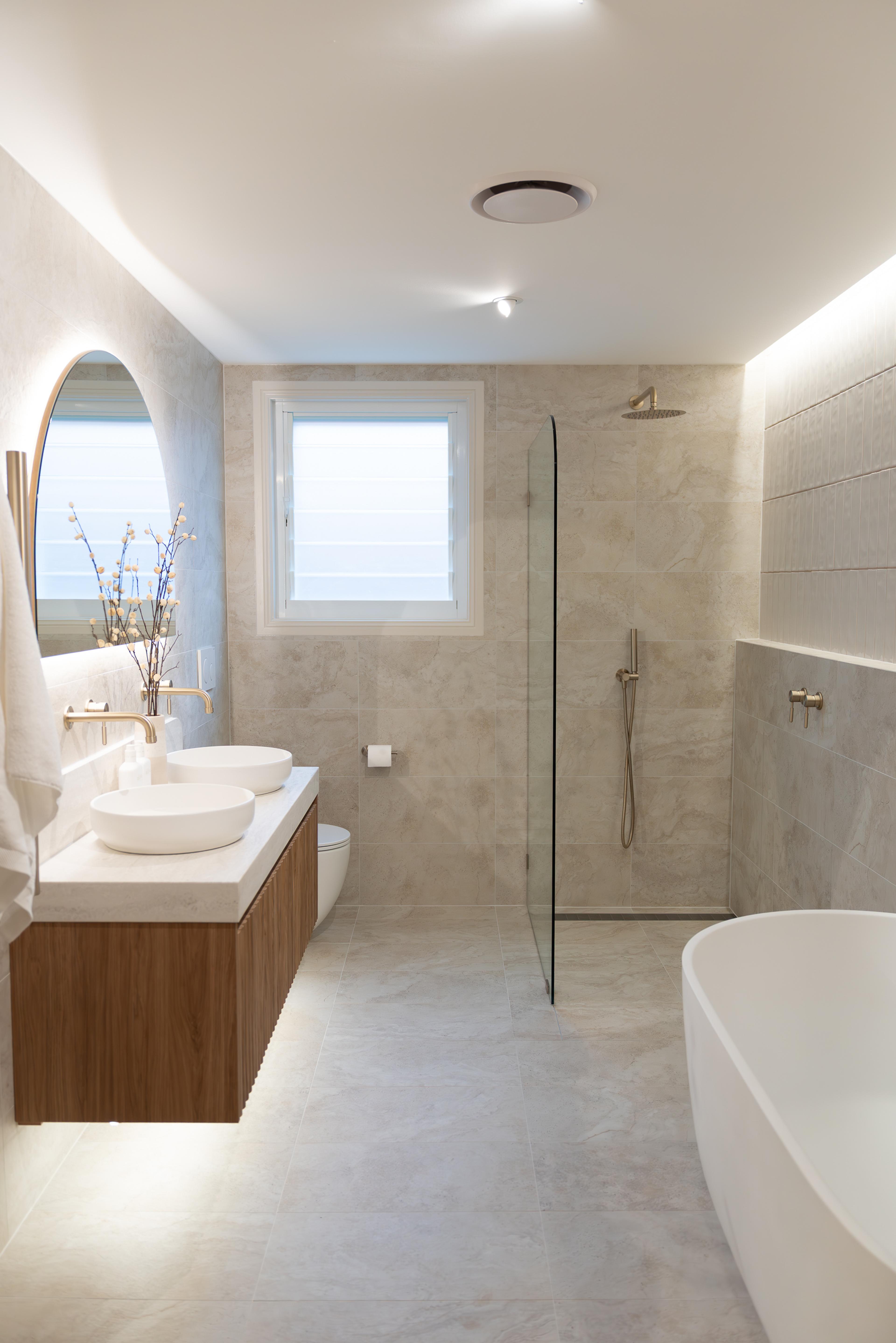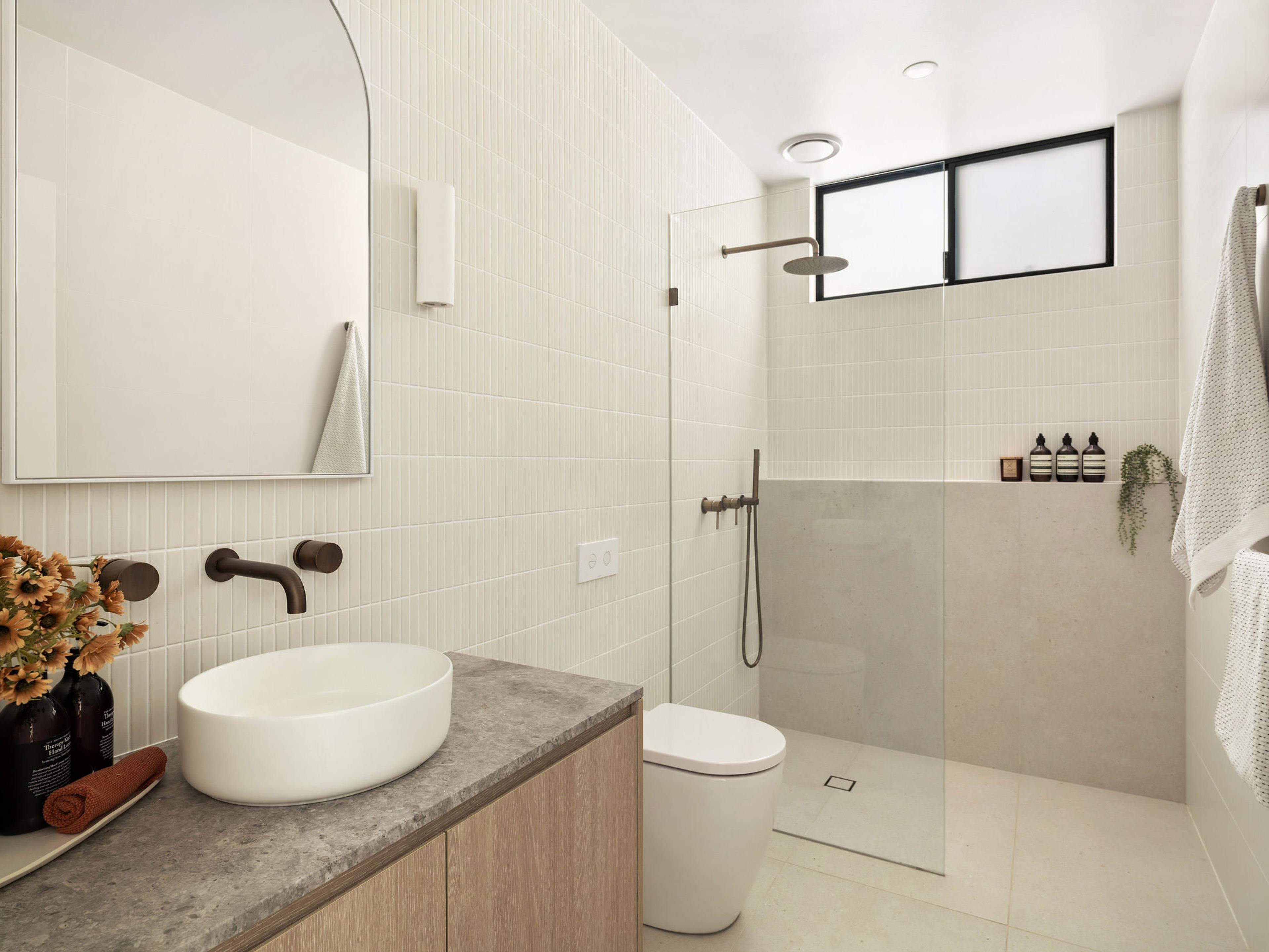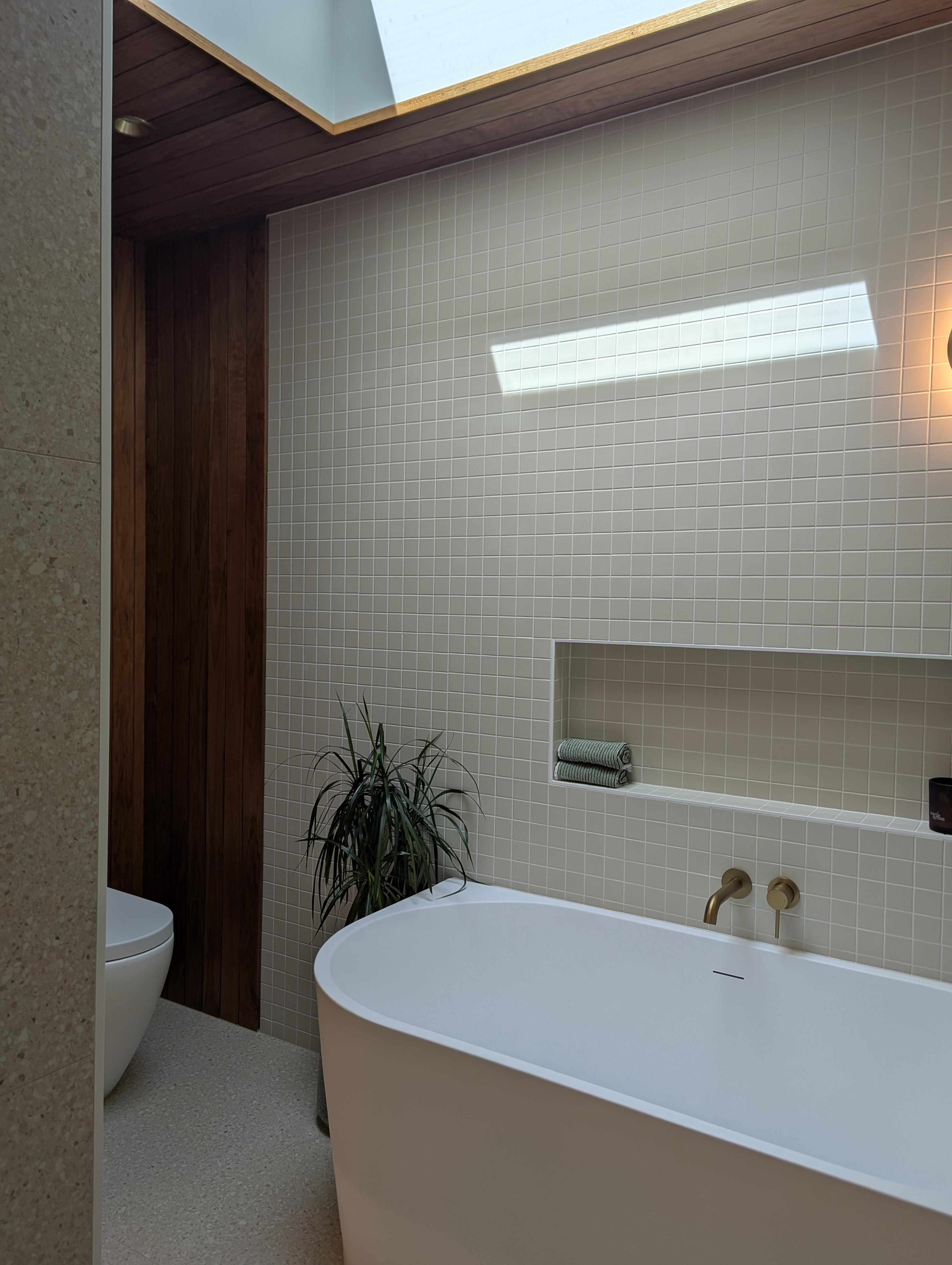 Juliana from @themounthaus has created a space that’s soft and layered, all while mixing textures across tiles, timber and tapware. When it comes to mixing tiles, this is your blueprint: tonal variation, finish contrast and clean lines.