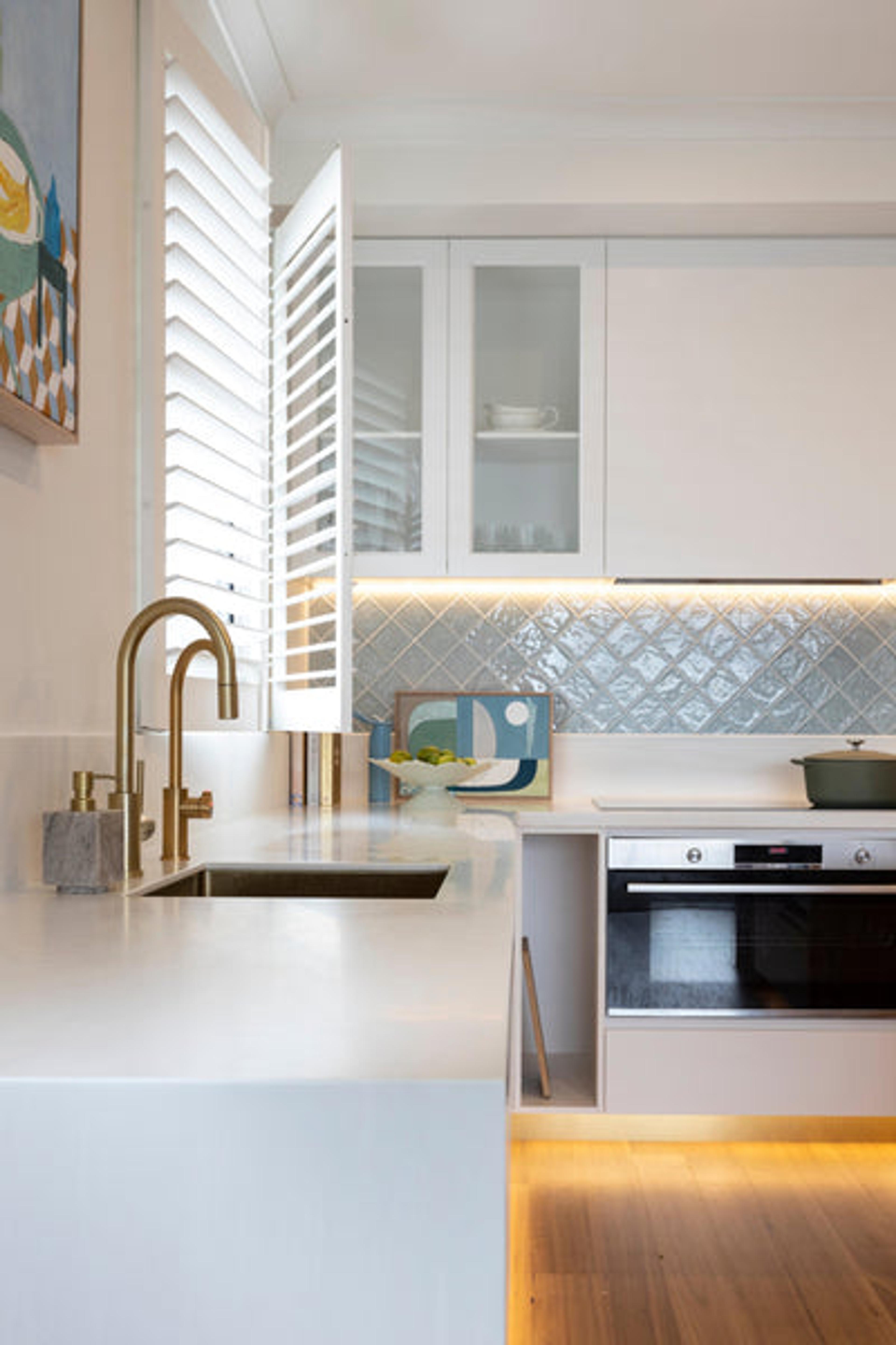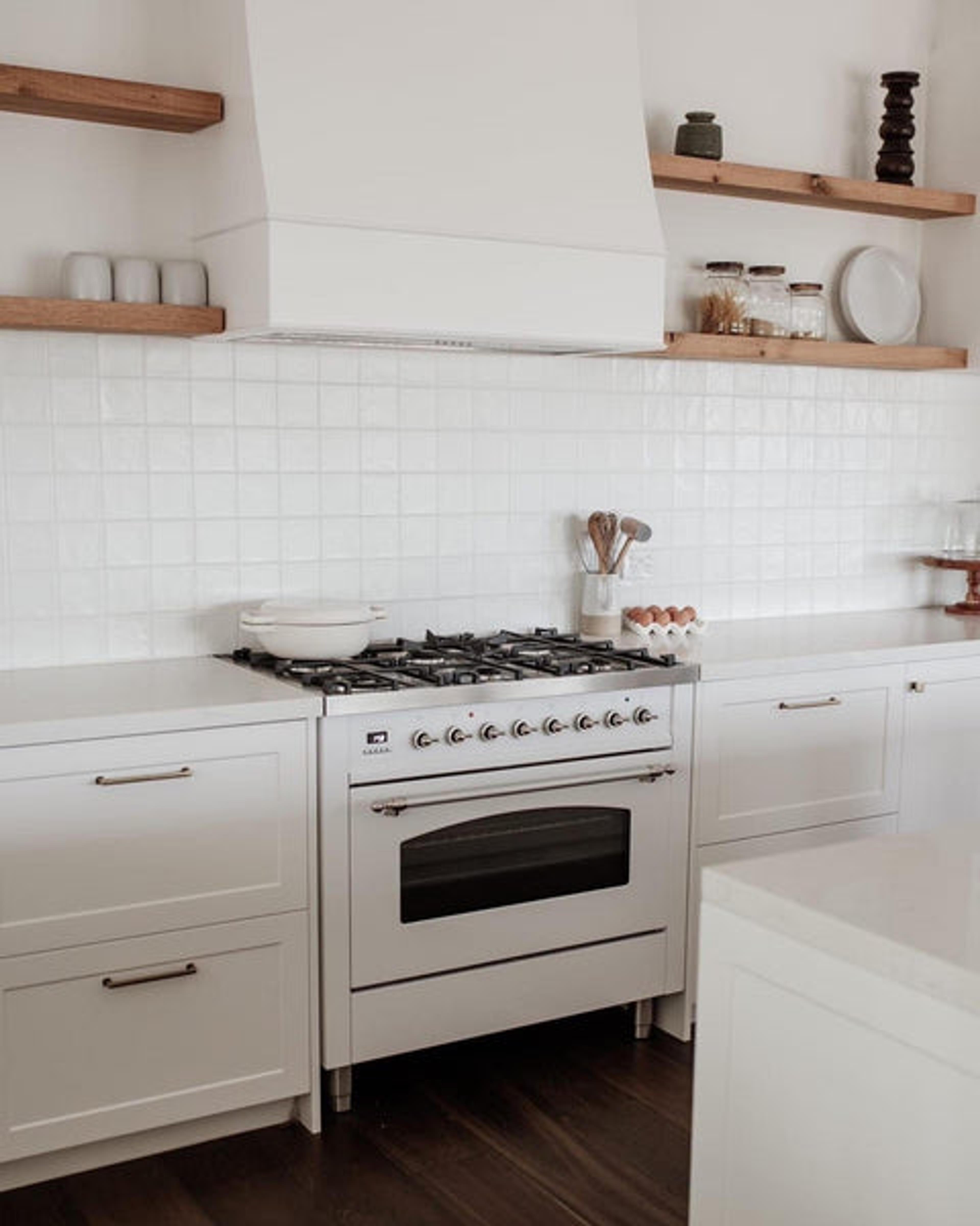 There’s something to be said about the best of both worlds — so why not play with two different-sized tiles for your kitchen splashback? Using both square and subway tiles in a matching colour adds a touch of quirkiness and visual interest while still keeping your tonal scheme intact. Lay the tiles randomly, one box each at a time, to create a balanced effect.