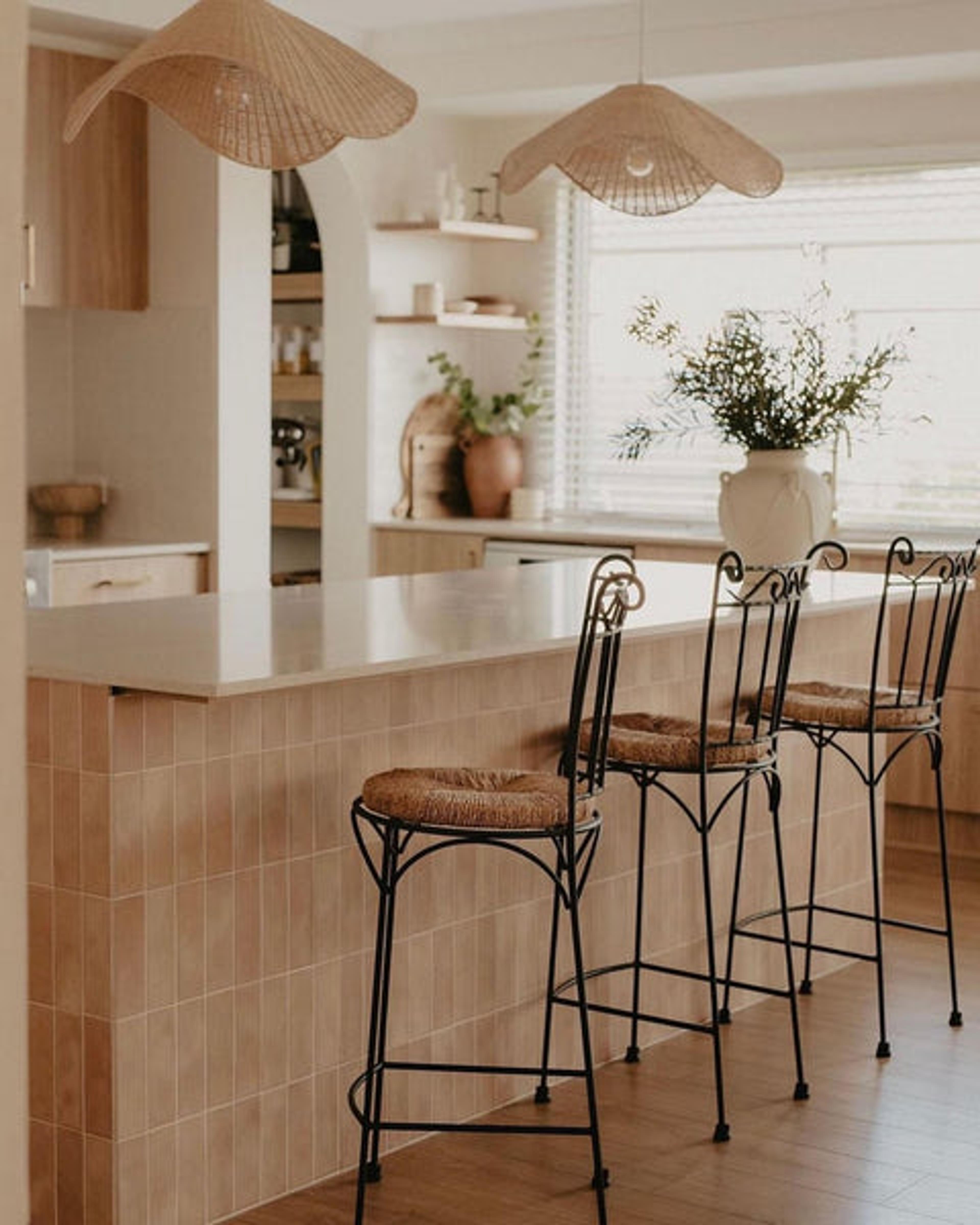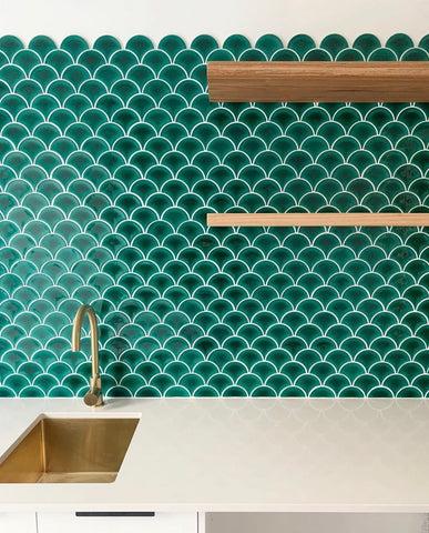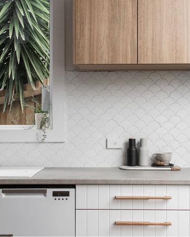 If you’re looking for funky and fun kitchen tile ideas, mermaid tiles are the answer. Also referred to as fish scale tiles, these tiles offer a pretty, feminine touch to your kitchen — not to mention the perfect amount of texture and kitsch vibes without going overboard.