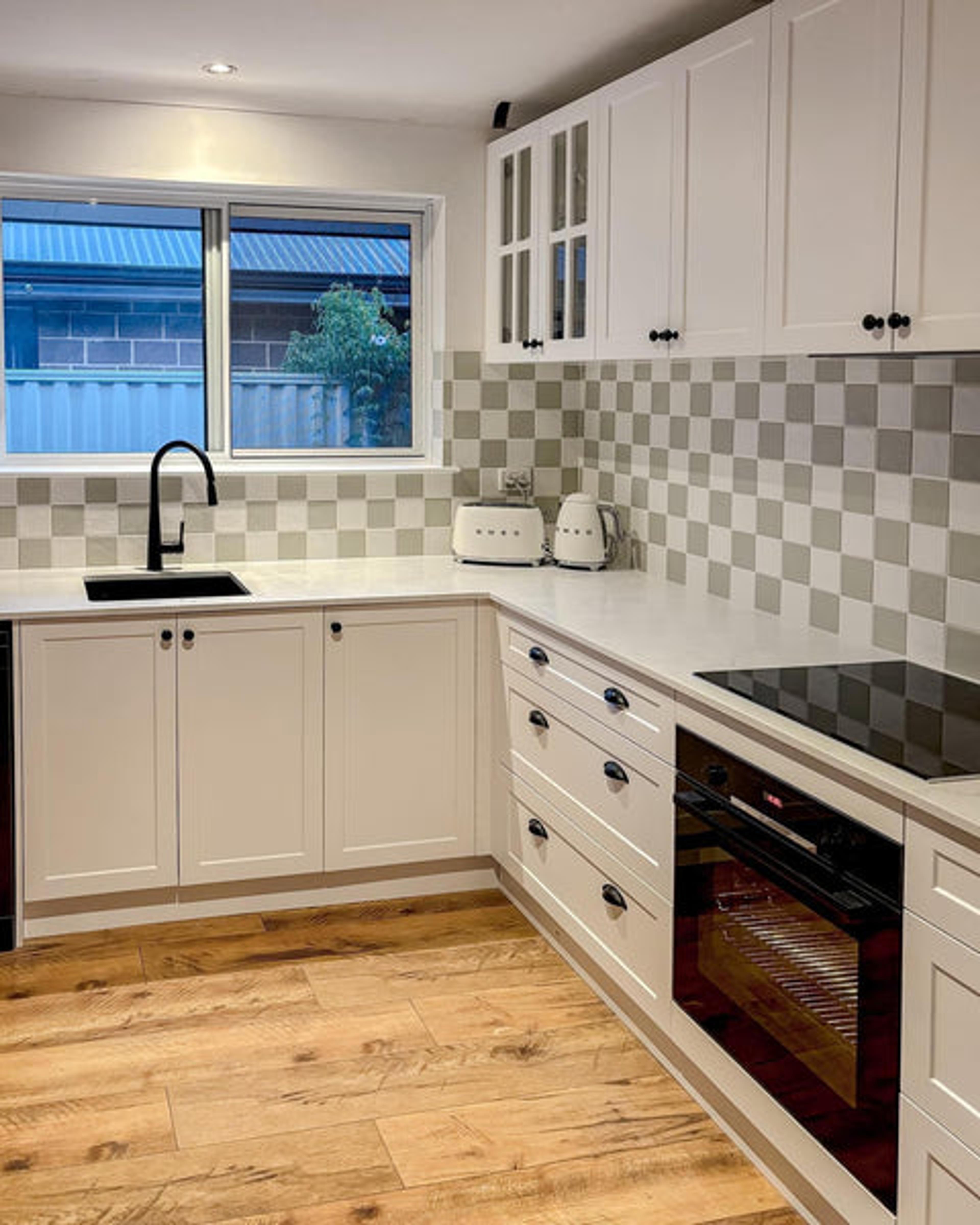 Tiles: Well, this answer is obvious! Choose tiles that suit your kitchen's style and are suitable for use in wet areas - all of the options we've suggested are up to the task. Ensure you have enough tiles to cover the entire splashback area, plus some extra for cuts and spares.