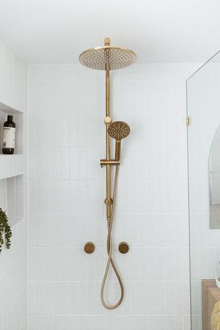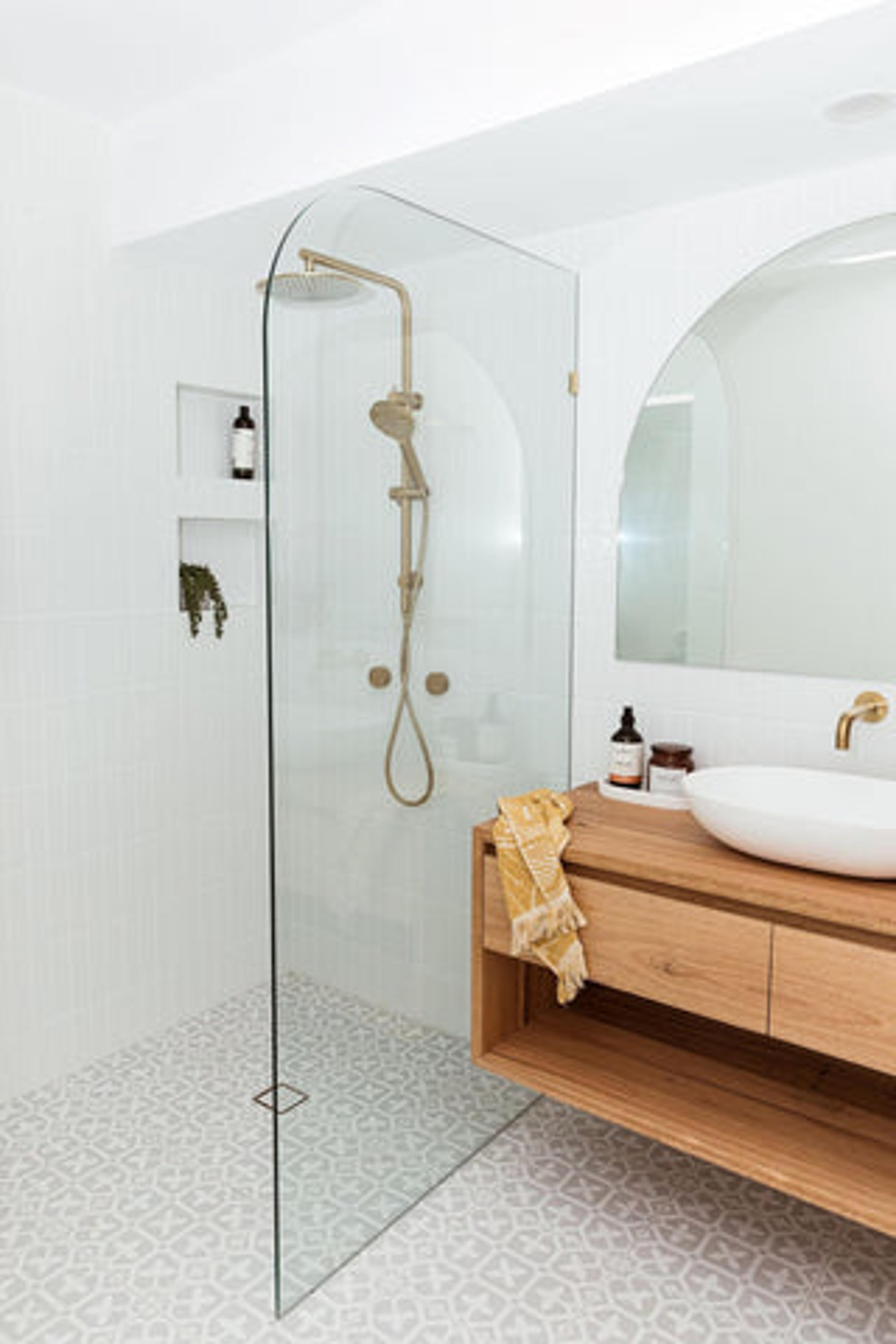 As Aimee and Jake chip away at the renos of their Gold Coast home, first to get a face-lift was their ensuite! Take a peek at this bright coastal/ scandi bathroom using our Palm Beach Grey Encaustic look tile, Newport Matt mini subway paired with the Brushgrove matt white tile.