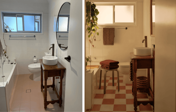 Like most renovators, Brooke and Gemma didn’t have a blank cheque when it came to their budget, so they had to compromise on a few small things and focus on what was really important to their vision – and found some savvy solutions to problems along the way. “We were aware that we wouldn't be able to afford a full reno of the bathroom so we decided to paint over the old floor tiles – they were originally a dark navy blue and made the bathroom feel cold and kind of boring,” they said. “We knew the muted pink paint job wouldn't be a long-term solution but it tied us over for a bit.”