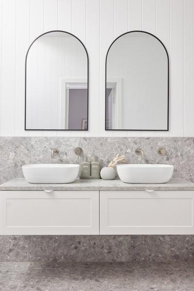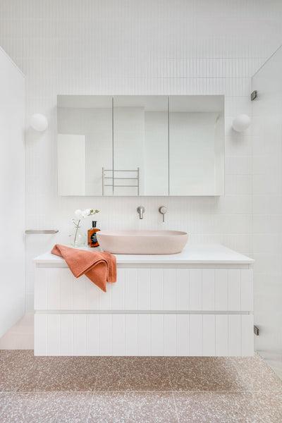 - Neutral: Think whites, warm greys, stone tones or soft clay. These give you more flexibility when it comes to furniture, tapware and tiles.