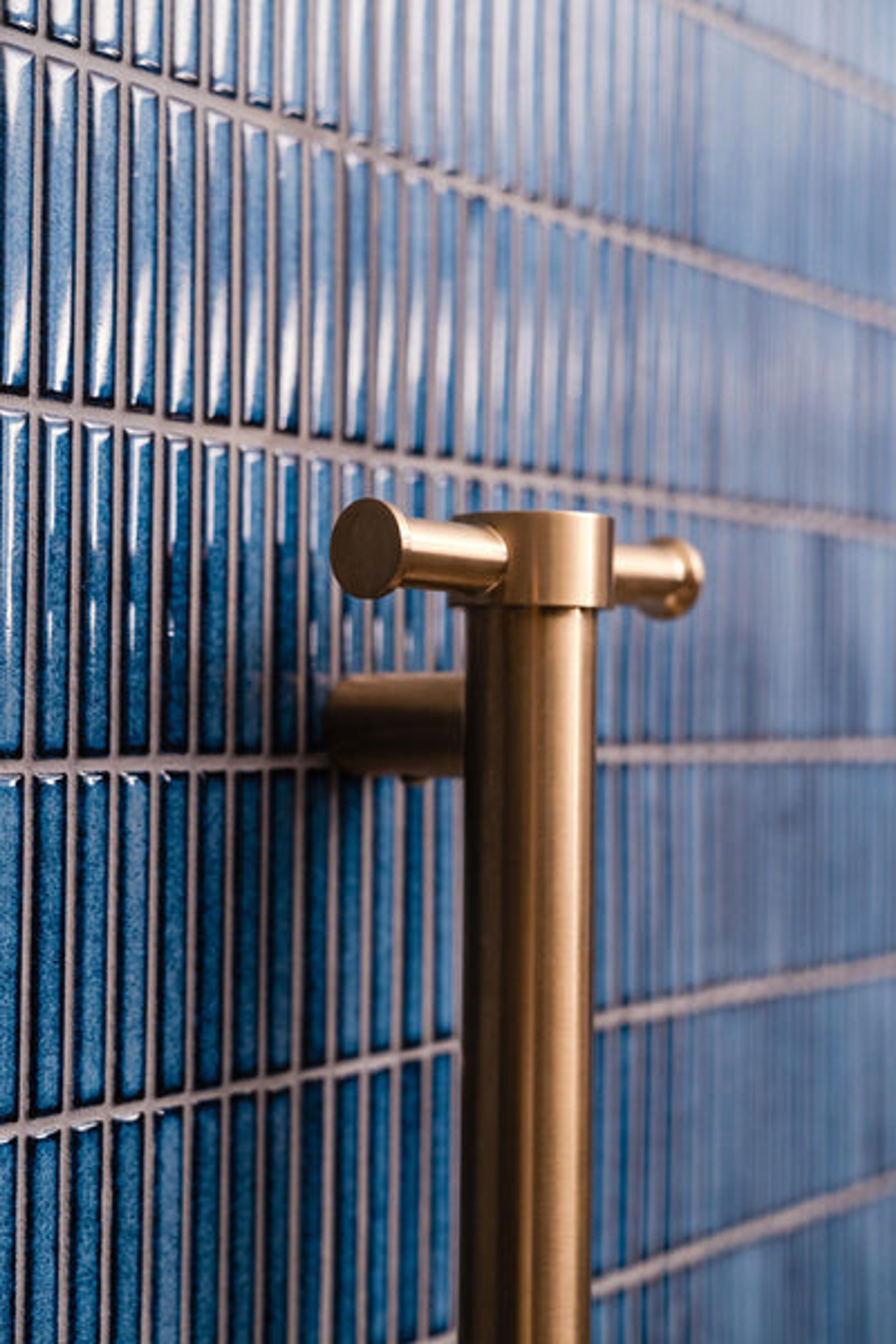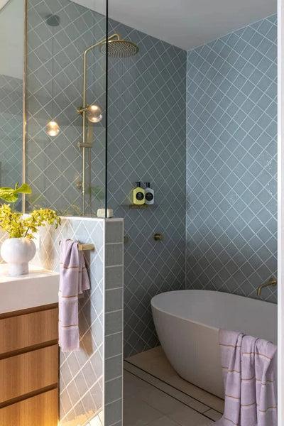 Blue is always a popular choice in bathrooms, but this one makes it feel fresh. The sky blue diagonal tiles add a fresh kind of movement, while the light grey grout, brass fixtures and timber vanity add enough warmth to balance things out. If you're after something cooler-toned that doesn’t feel cold, this one’s a good fit.