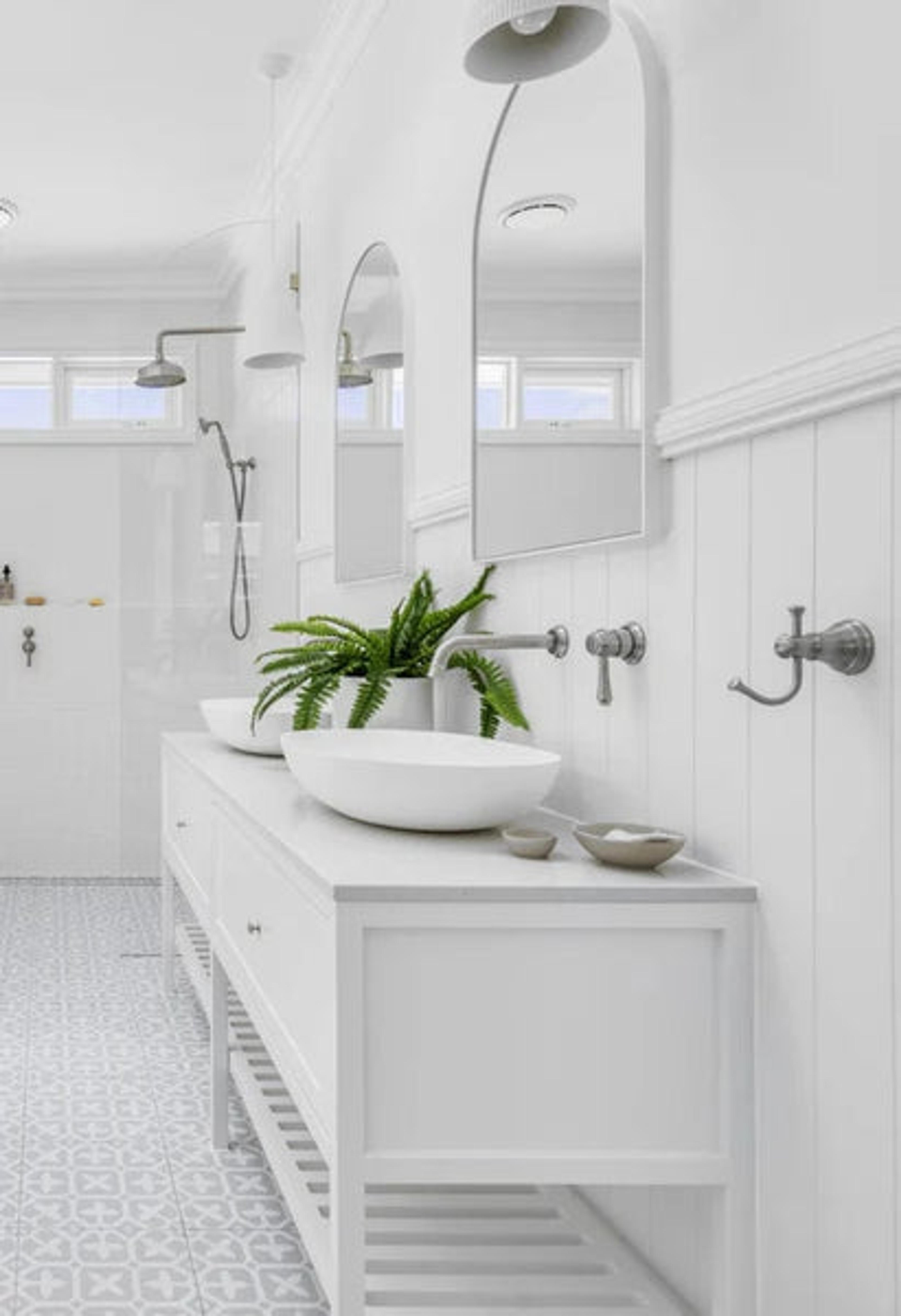 This bathroom keeps everything in a white-on-white scheme, but it doesn’t feel flat. The different surfaces — panelled walls, patterned floor tiles and matte fixtures — create enough variation to keep it interesting. This is a strong example of how to do monochrome while still making the space feel finished.
