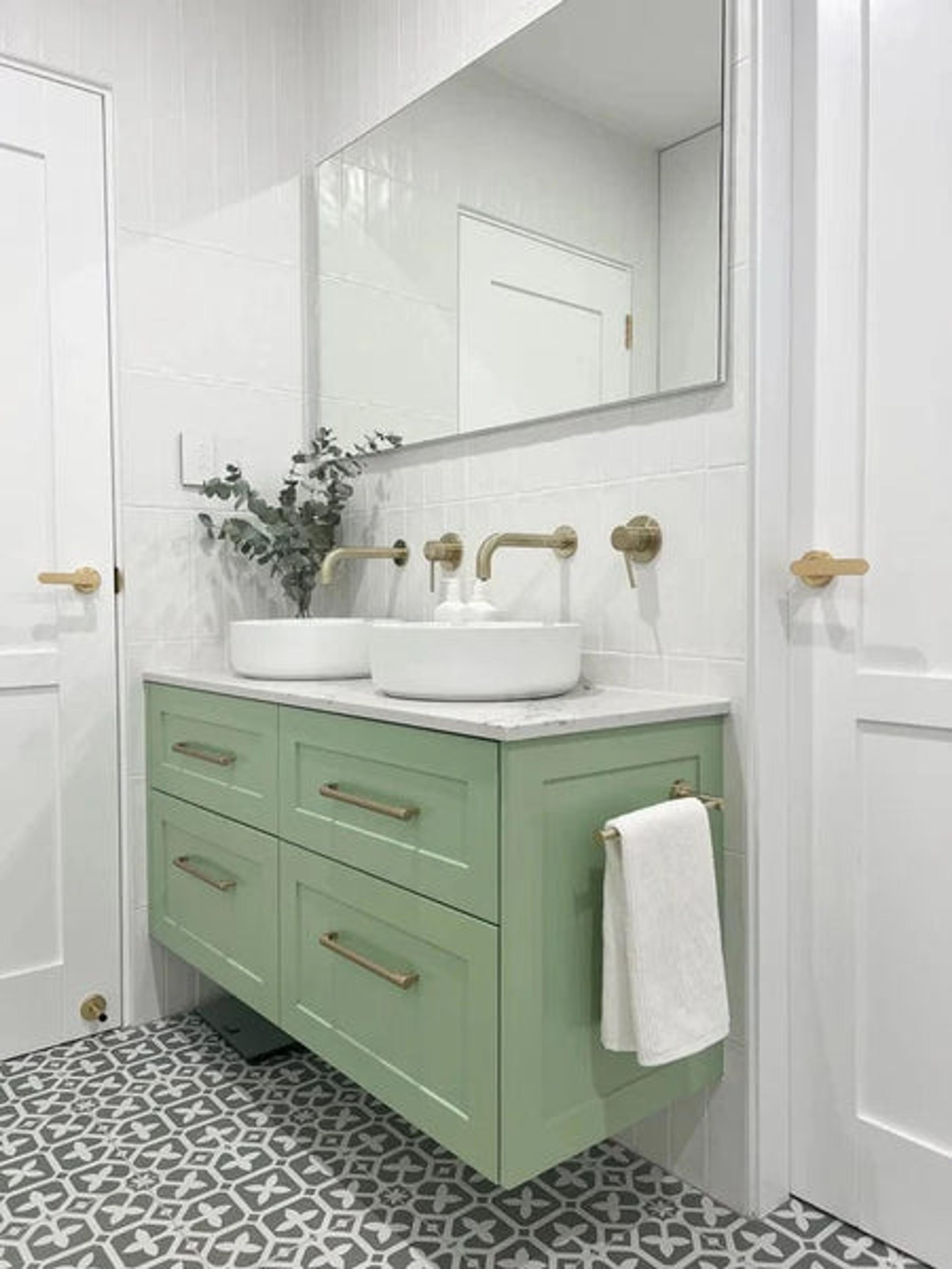 This one’s a good balance between traditional and modern. The soft green shaker vanity feels classic, and the patterned floor tiles add contrast. A simple white tile on the wall keeps the rest of the room from getting too busy. The brass tapware and handles tie it together.