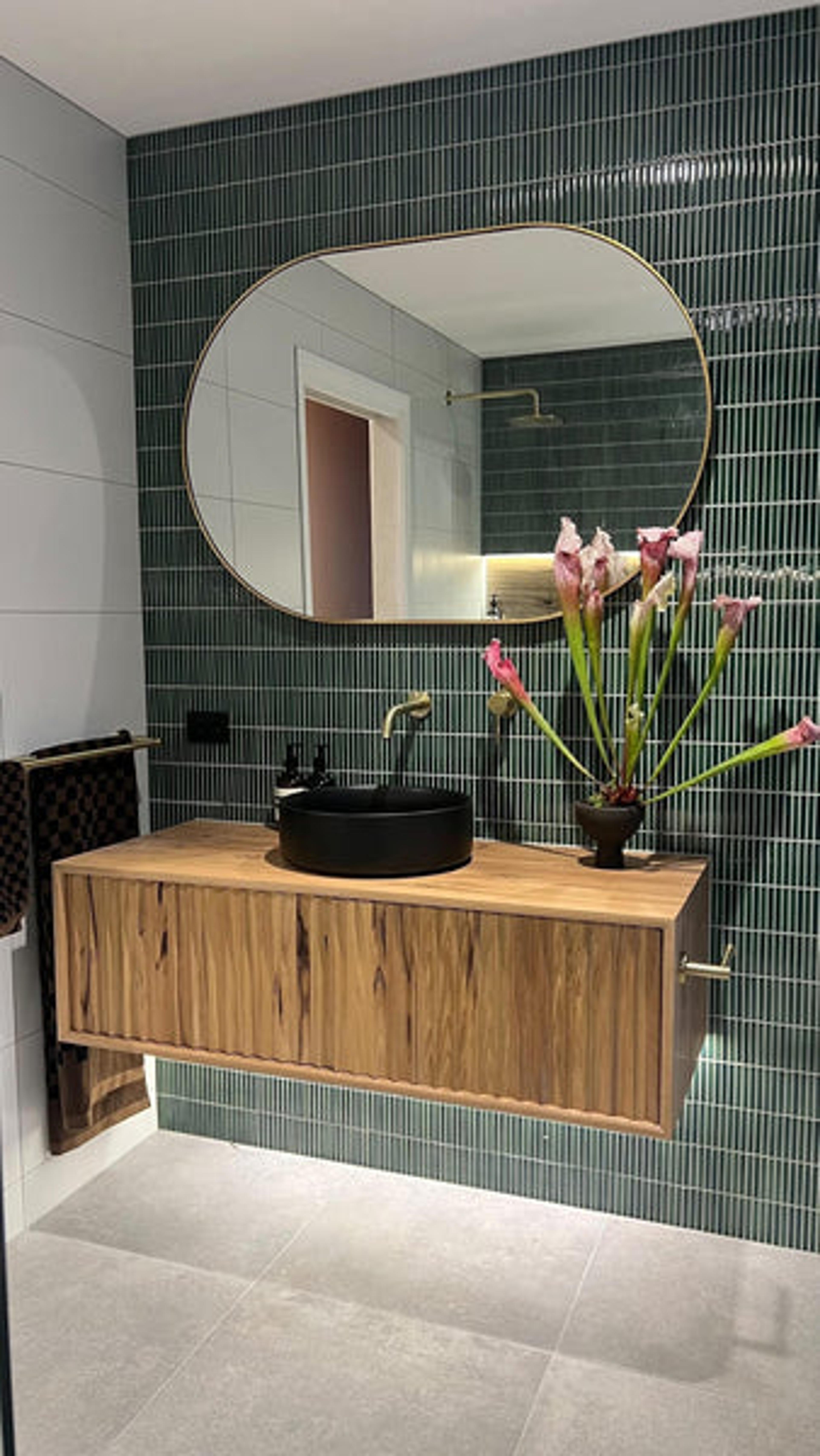 This space mixes a few bold elements in a clean way — sage green subways, speckled terrazzo floors and a simple timber vanity. The green tiles and painted door match, which helps the room feel cohesive.
