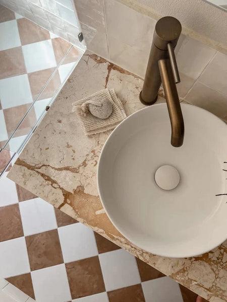 In this bathroom, material choice carries the colour scheme. The terracotta and white checkerboard tile flooring brings in warmth, while the stone benchtop with similar earthy tones keeps things consistent. An Antique Brass Mixer finishes it off. This could be a good scheme for someone looking for something that leans warmer but still feels natural.