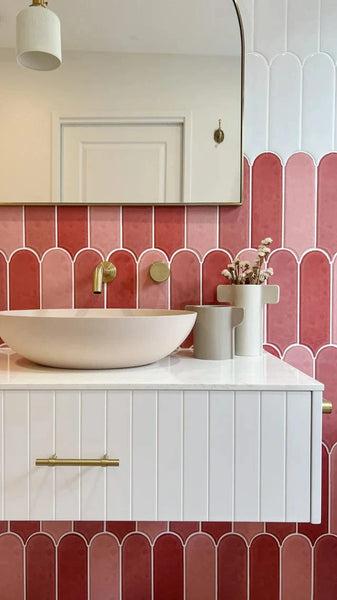 Time for a statement moment! This bathroom goes bold with pink but keeps it clean. The vertical feathered tiles move through a gradient of tones, making the colour feel layered rather than flat. The vanity and basin are simple — white with soft curves — which lets the wall stand out.