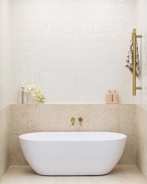 Here, the colour scheme is soft and tonal, but the material choice still gives it depth. The beige terrazzo tiles blend nicely into the white tub and zellige tiles. The brushed brass tapware also easily complements the bathroom.