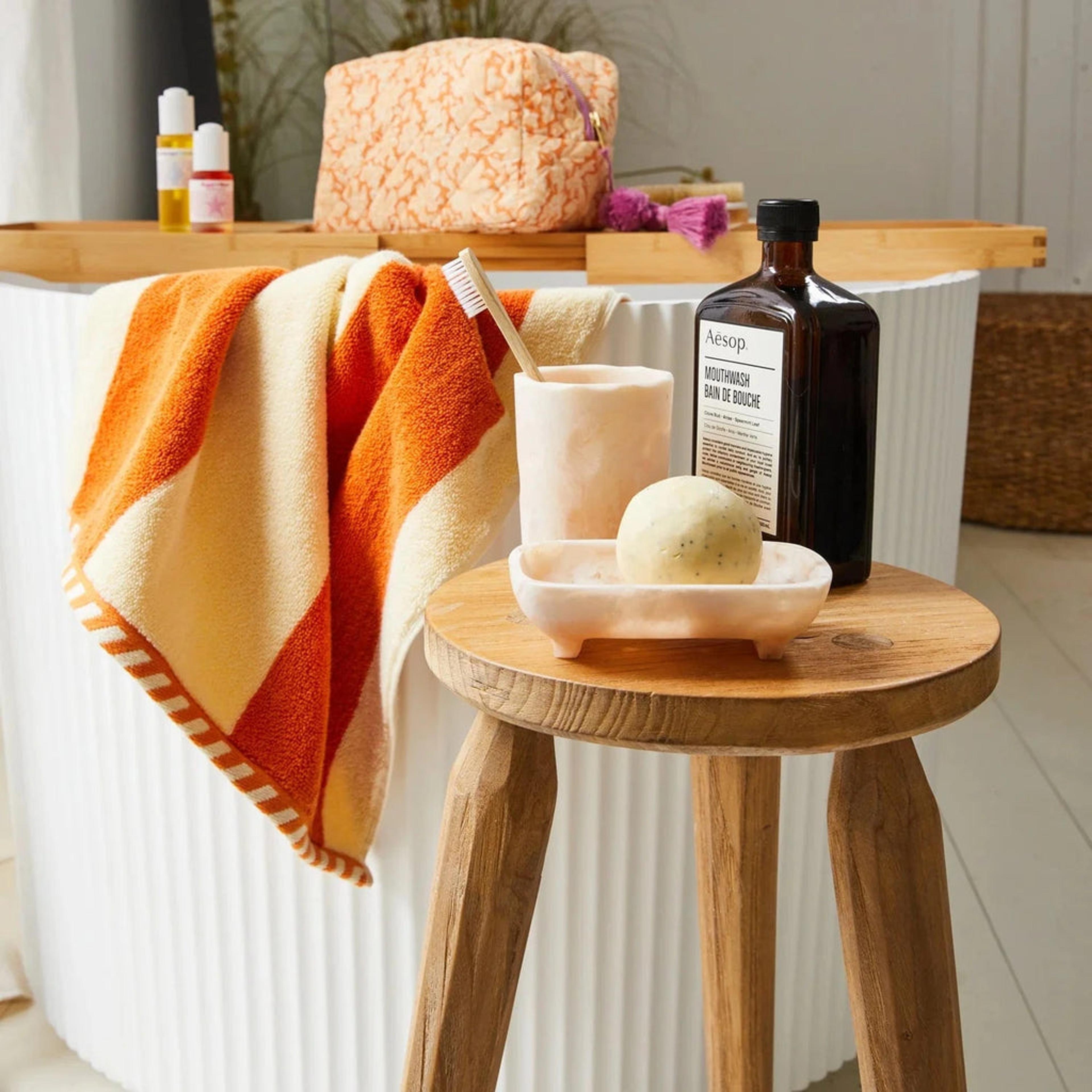 To elevate your bathroom style we love Sage and Clare’s range of joyful towel designs, if you want to add a splash of vibrant personality (all the while sporting the colours of the season, hello pink and red combo) then opt for the Florence Hand Towel in Cherry, or for minimalist bathroom essentials take a look at the toned-down Didcot Hand Towel in Persimmon offering a cool, retro vibe.