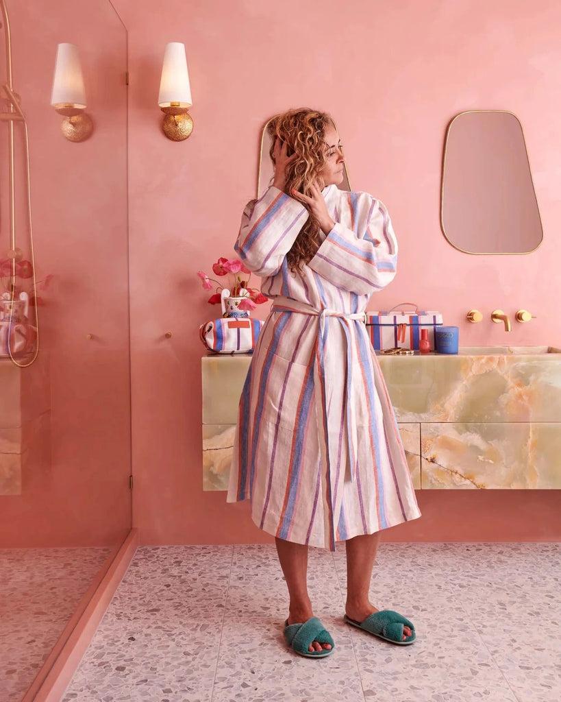 The Maldives Stripe Linen Robe from Kip and Co effortlessly blends style with comfort. This lightweight French flax linen robe is ideal for lounging and adds a pop of colour with its blue, red, pink and purple stripe pattern on a creamy white base.