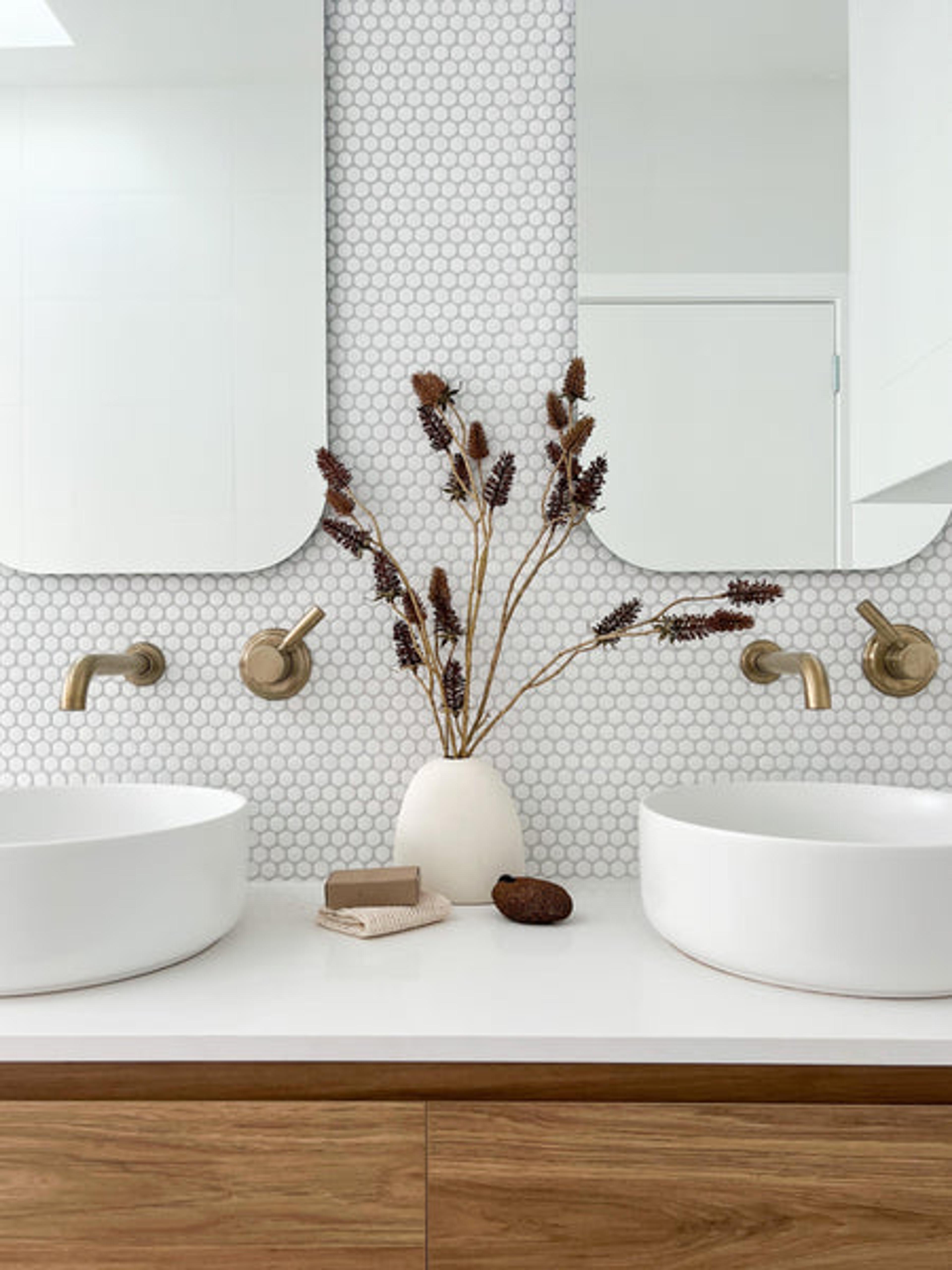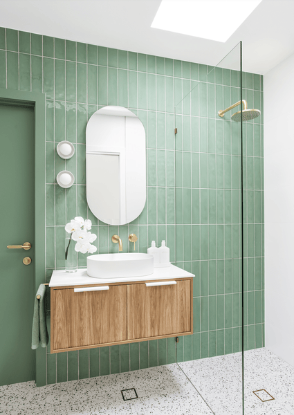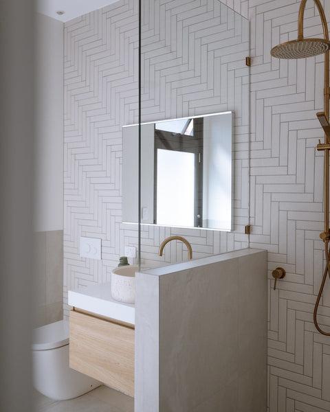 Positioning your feature wall behind a freestanding bath or vanity can highlight these elements in your space and create a beautiful feature. It’s a common spot to place a feature wall and for good reason! There are many upsides to this design choice. A well thought out feature wall can energise a smaller bathroom, for example. A vanity or bathtub can often naturally be the first thing that catches people’s attention when entering a bathroom so a contrasting tile behind it often feels like a fitting placement and gives the room a fresh vibe.