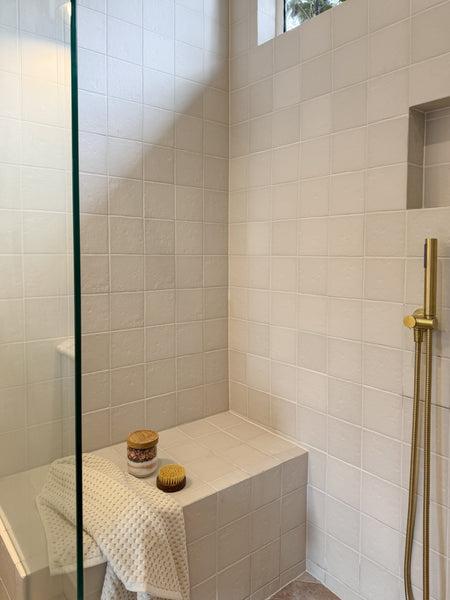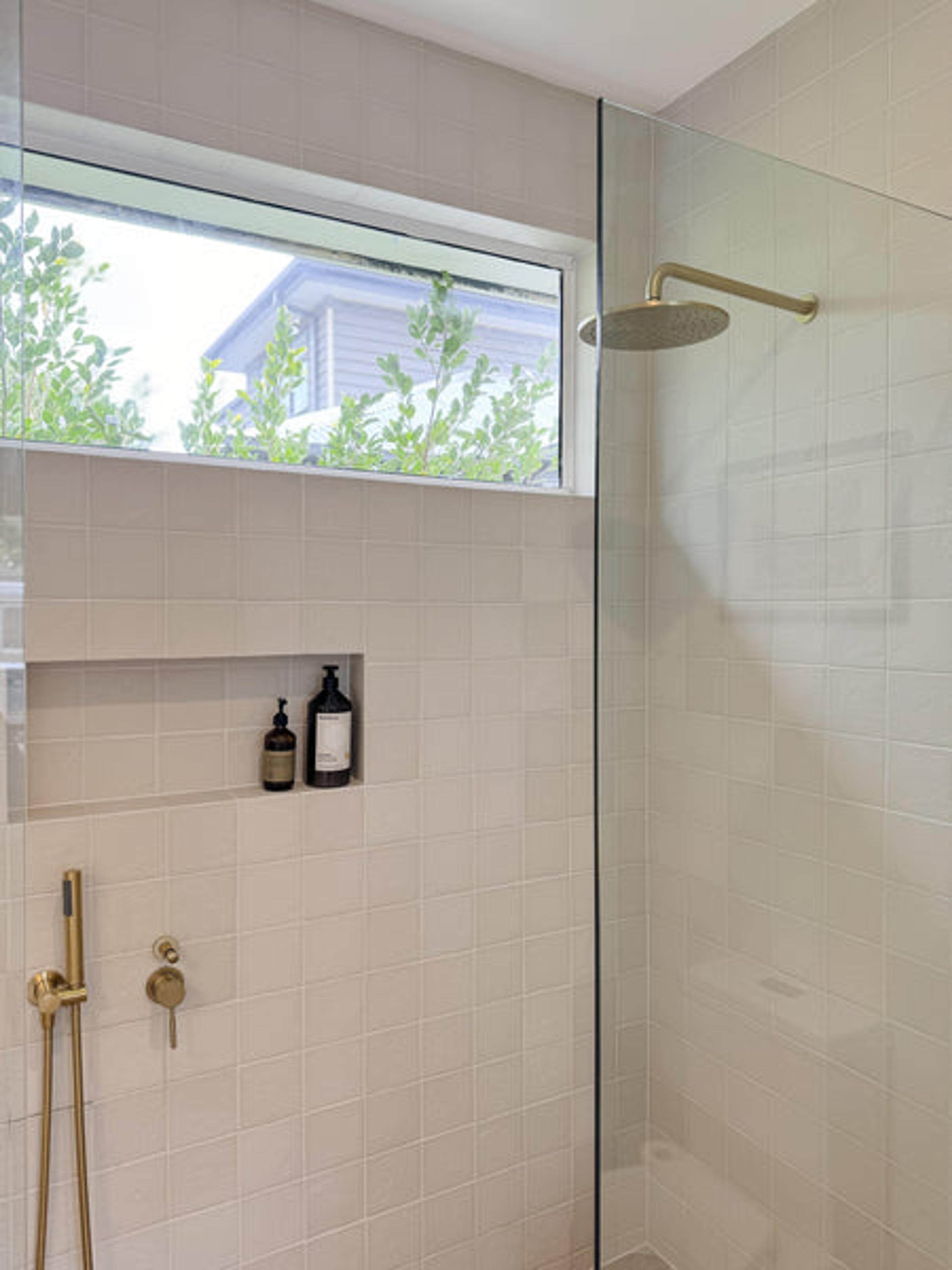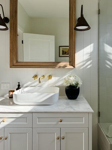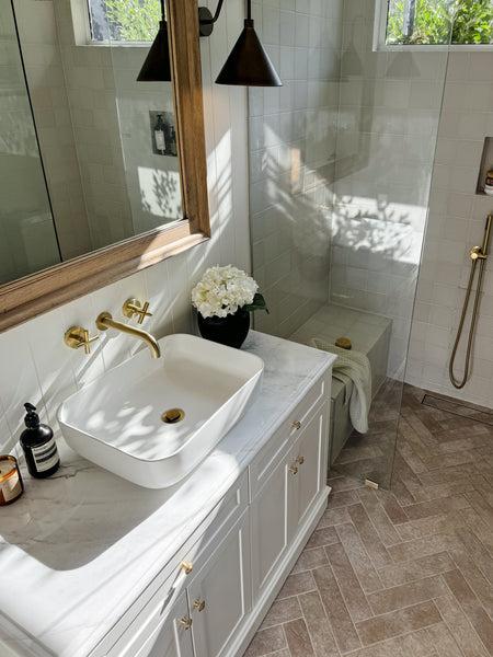 Danielle also praised some of Cameron’s other design decisions, including his choice of tiles. “Cameron also suggested the Thirroul Subway Tiles, and after some discussions with TileCloud, we realised they would work well together,” she says. “In the end, I think Cameron might have a better eye than me (sometimes)!”. Along with the Thirroul Bone Matt Subway Tiles, Danielle and Cameron also went with Albert Park Square Matte Vanilla Tiles for the bathroom space. Complementing the tiling was the choice of tapware: Wall Spout + Cross Taps Brushed Brass, Shower Hose + Sprayer Brushed Brass and Wall Shower Arm and Head Brushed Brass, which all pulled together the overall look.