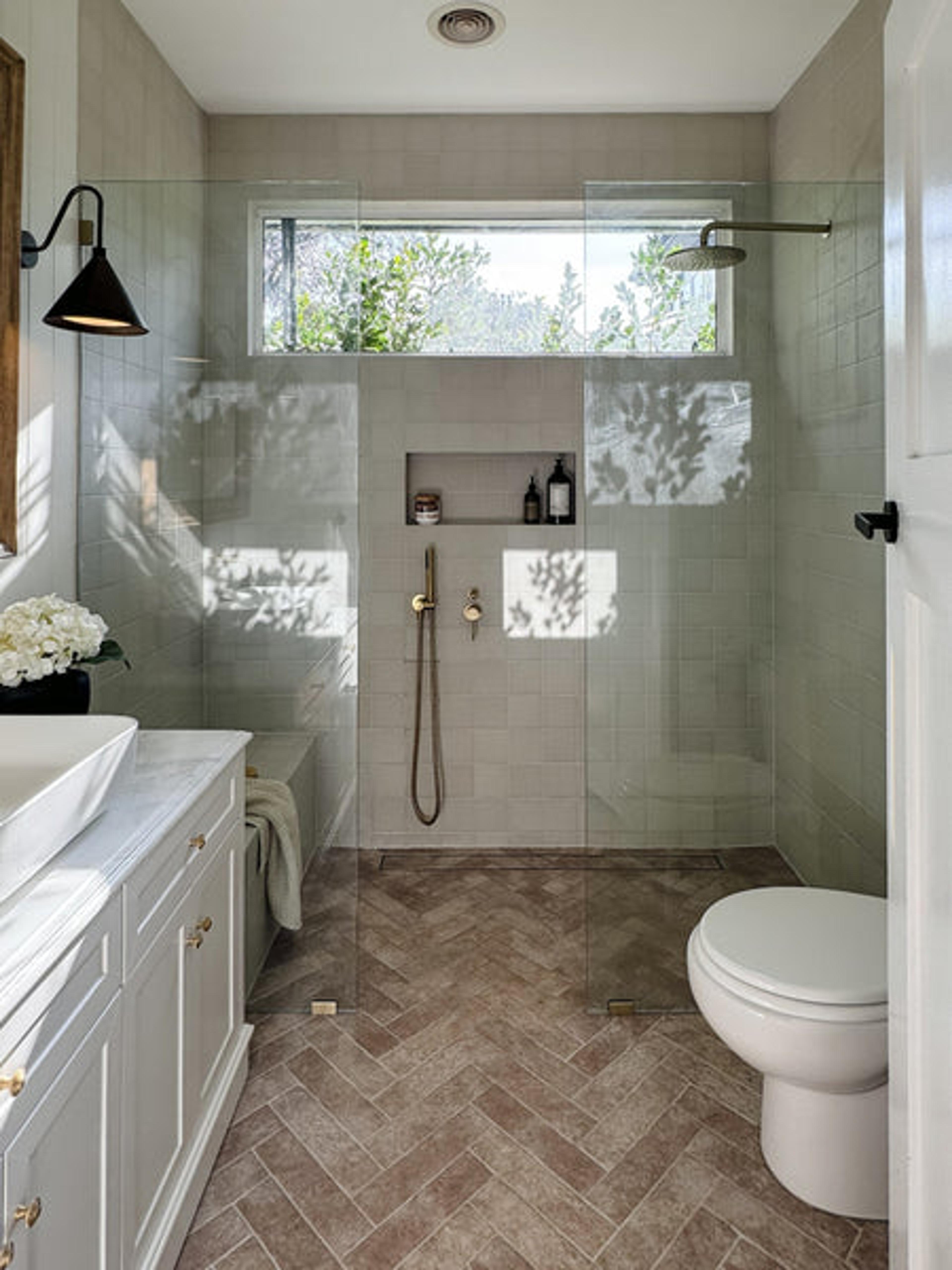 Danielle says they kicked off by working together to figure out whether to change the structure of the bathroom with resale in mind, but ultimately decided on a faster turnaround design that maximised the existing space. “We discussed our vision as a couple, knowing we were flipping the house and needed to appeal to either a young family or an older couple looking to downsize,” Danielle explains. “Although we couldn’t fit a bath, we opted for a bench seat to keep the space both luxurious and practical. A large vanity was essential for storage in a three-bedroom home, and lighting was also a huge priority since the previous bathroom was so dark.”