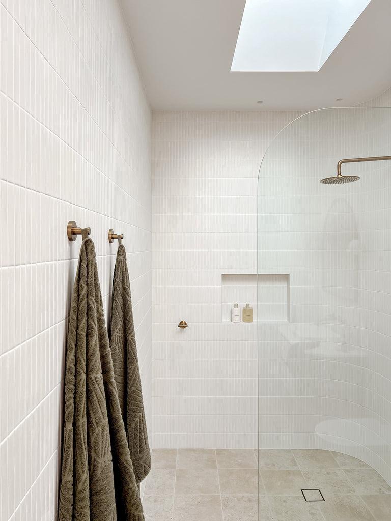 Brunswick Kit Kat Matte White Tile on the walls and Seaforth Travertine Look Beige Matte Tile on the floor.