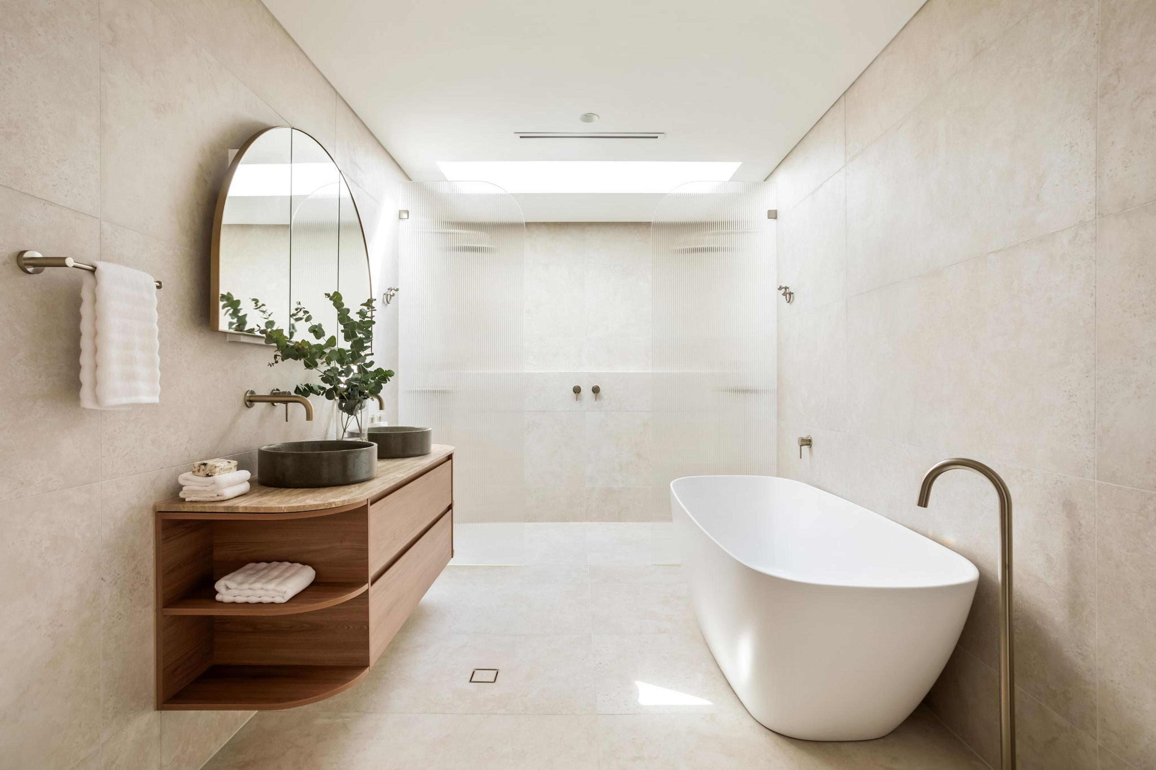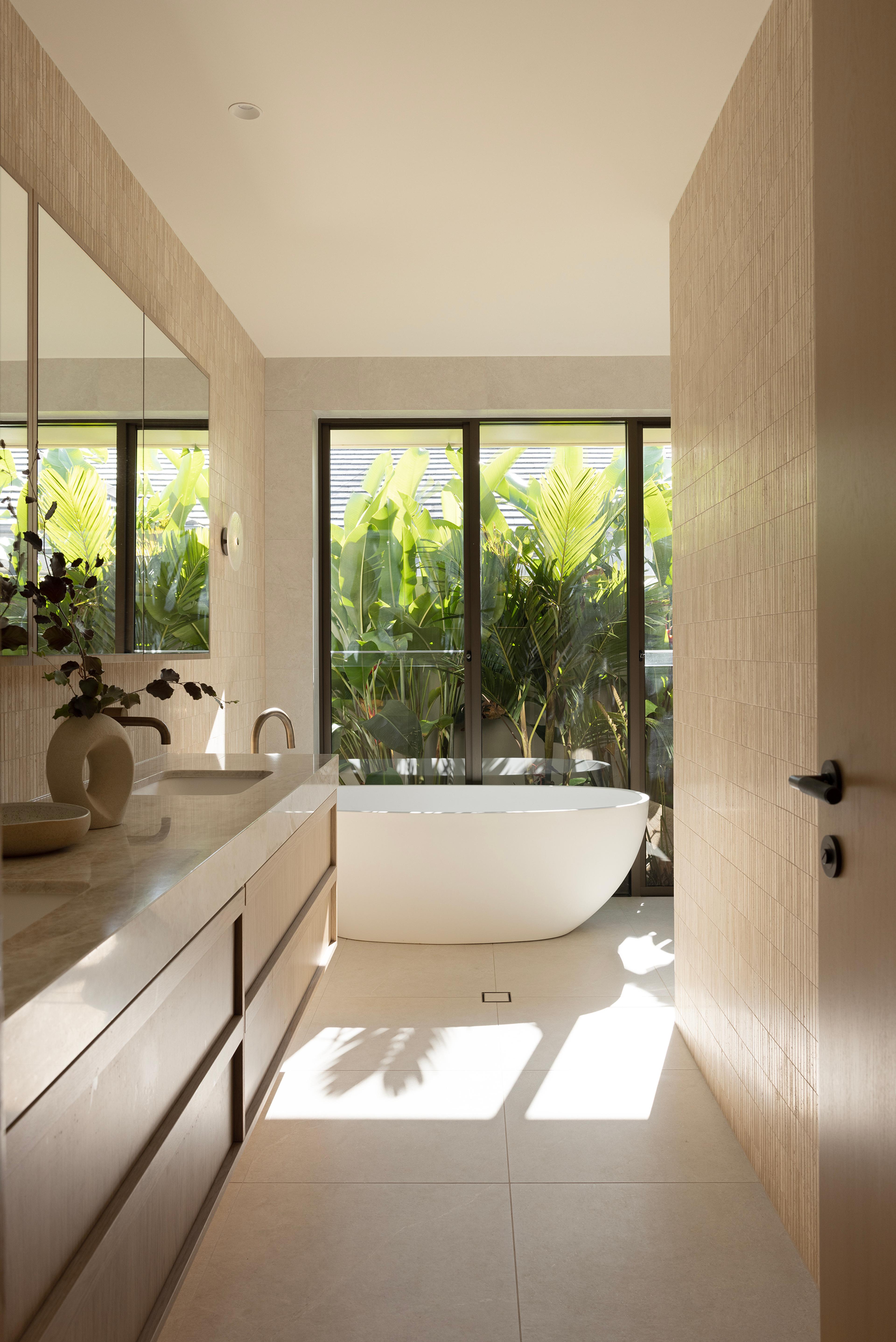 Indoor and outdoor greenery, stone countertop, floor and walls, wooden cabinetry and glass doors for direct access to natural light and outdoor view. Using our Coogee Antique Beige Matte Kit Kat Mosaic Tile and Sydney Matte Sand Stone Look Tile creates a similar effect to this stunning example of a modern bathroom.