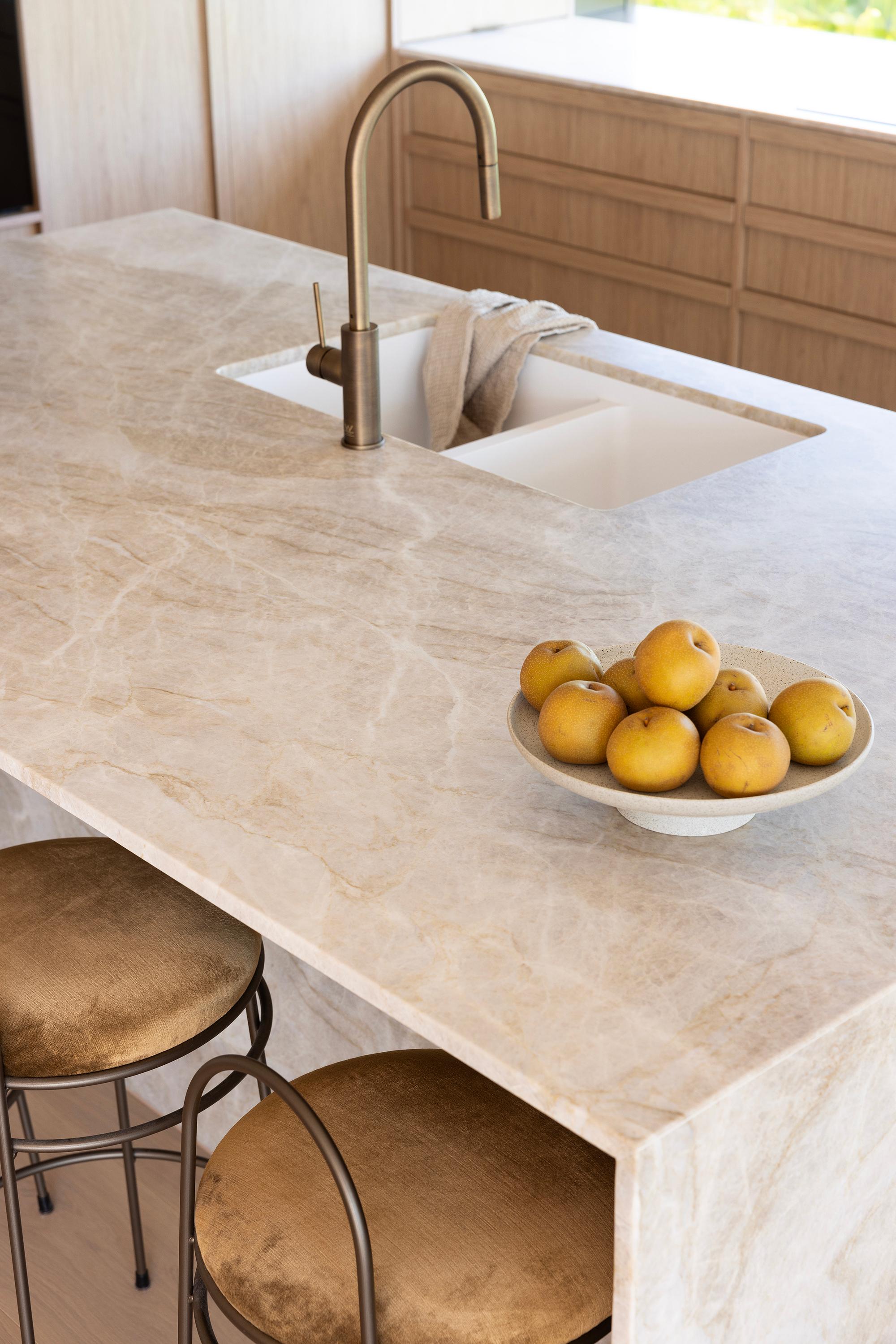 Stone walls, countertops, flooring, greenery, wooden cabinetry, and a skylight to let in plenty of natural light. Check out our Kirribilli Travertine Look Beige Matte Tile or Sydney Matte White Stone Look Tile to bring a similar look to your space.