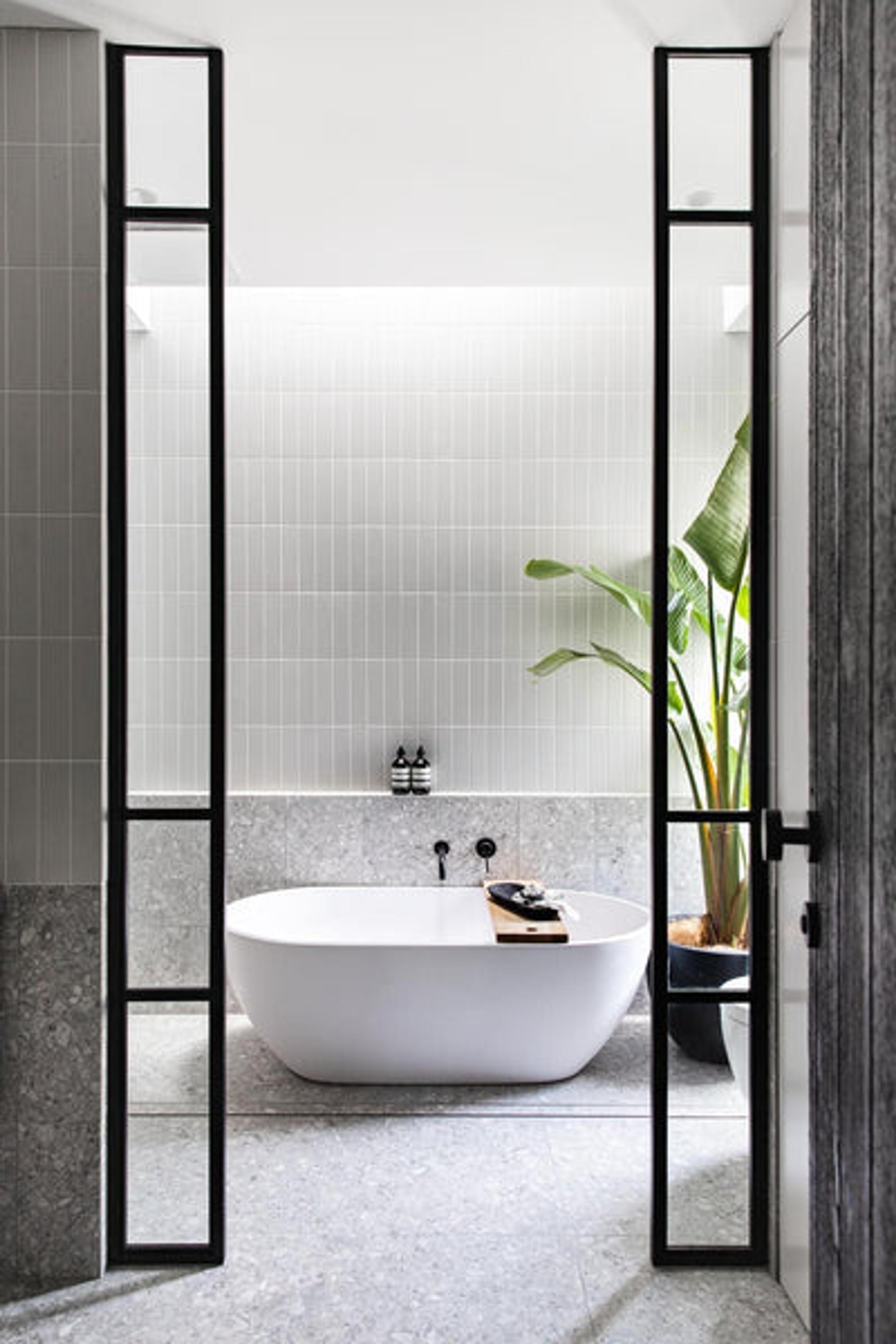 This space centres around a white freestanding bath, which really stands out thanks to the way the entry is framed with black panels.