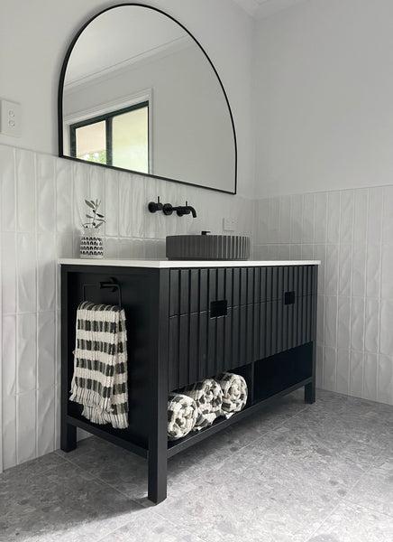 This idea is also practical — vanities are easier to update and refresh than floors or wall tiles, so it’s a safe way to experiment with darker colour. It also gives the room a bit more definition and can help anchor other details like black tapware or mirror frames.