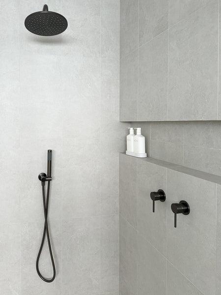 Instead of boldness, this bathroom leans on minimalism. The Sydney Matte Grey Stone Look Tile has an understated vibe that can cover every surface without feeling overwhelming. It’s paired with Yabby’s Gunmetal tapware, which creates a little touch of contrast.