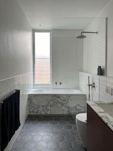 And even though the bath is the focus, the tile choices are doing a lot of work in the background. The Riverton Matte Grey Subway Tile wraps around the top of the walls, while grey terrazzo tiles cover the lower half.