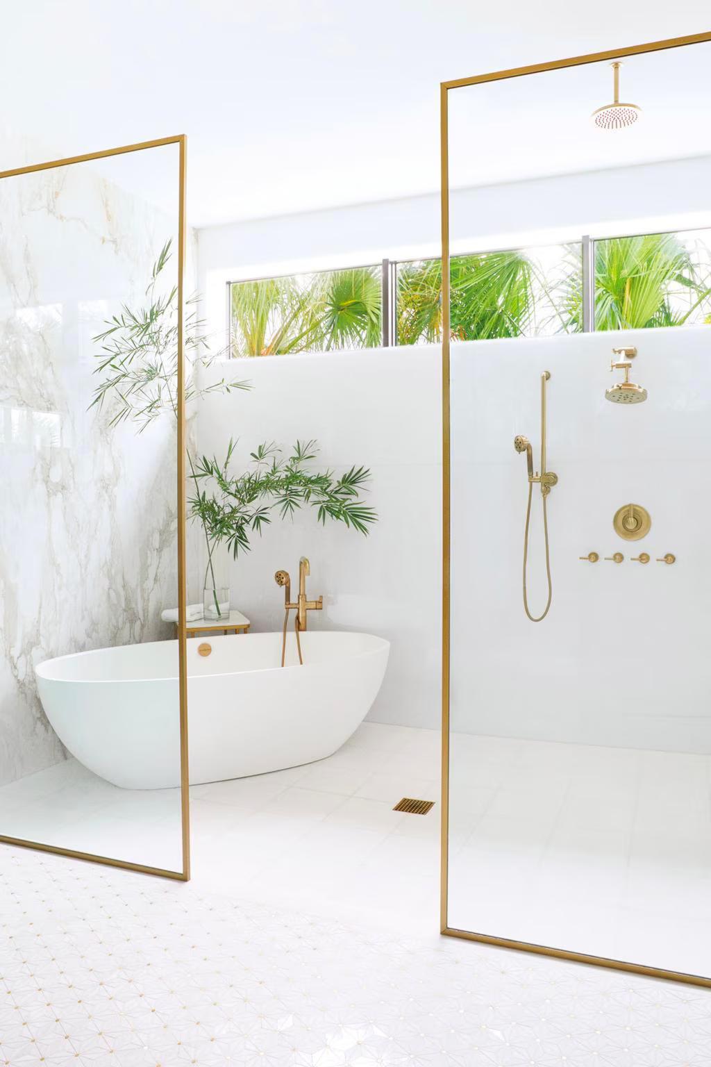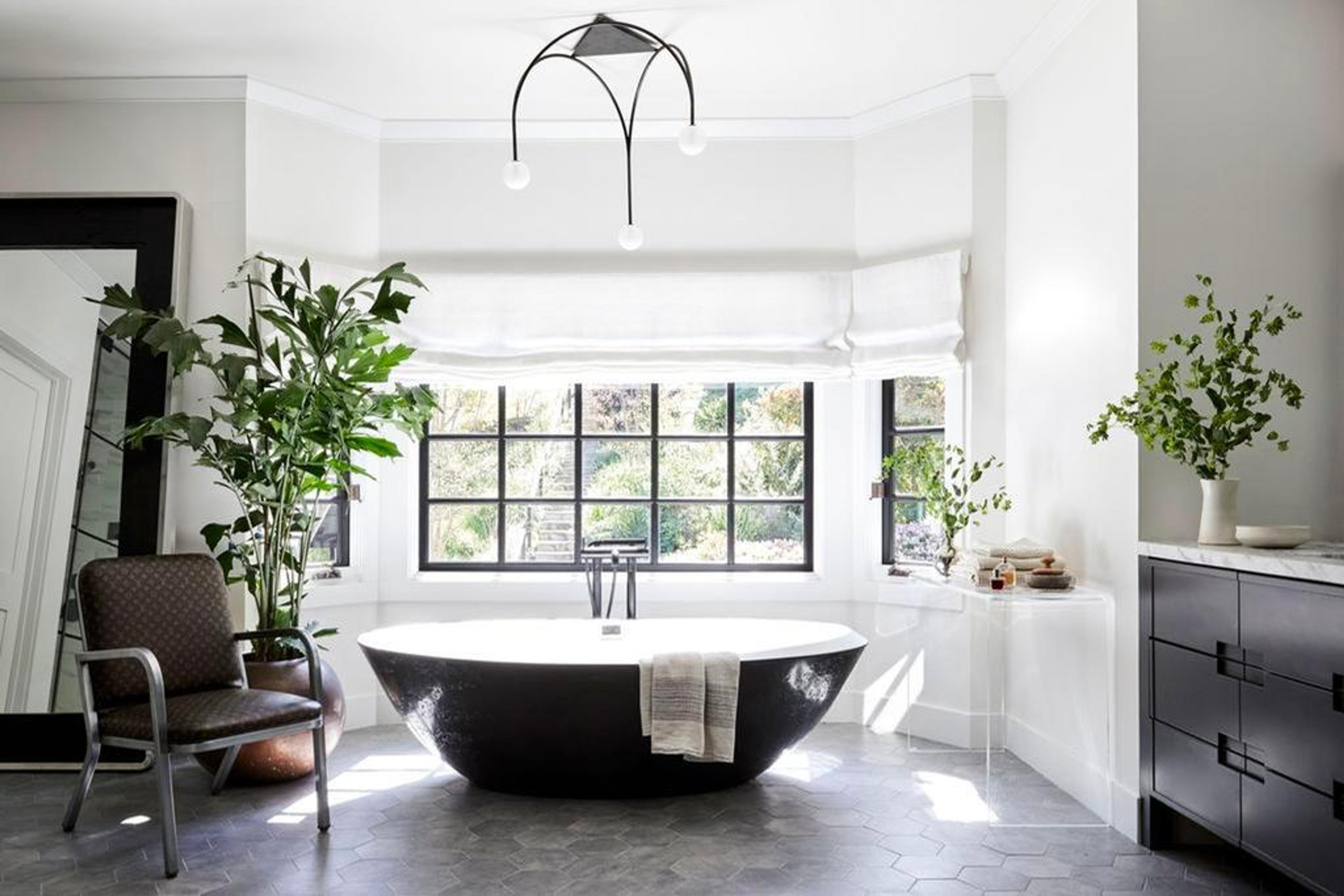 Miley Cyrus’ bathroom treats tiles as a feature rather than a backdrop. A soft grey, hexagonal tile on the floor brings together the natural elements — greenery and plenty of sunlight.