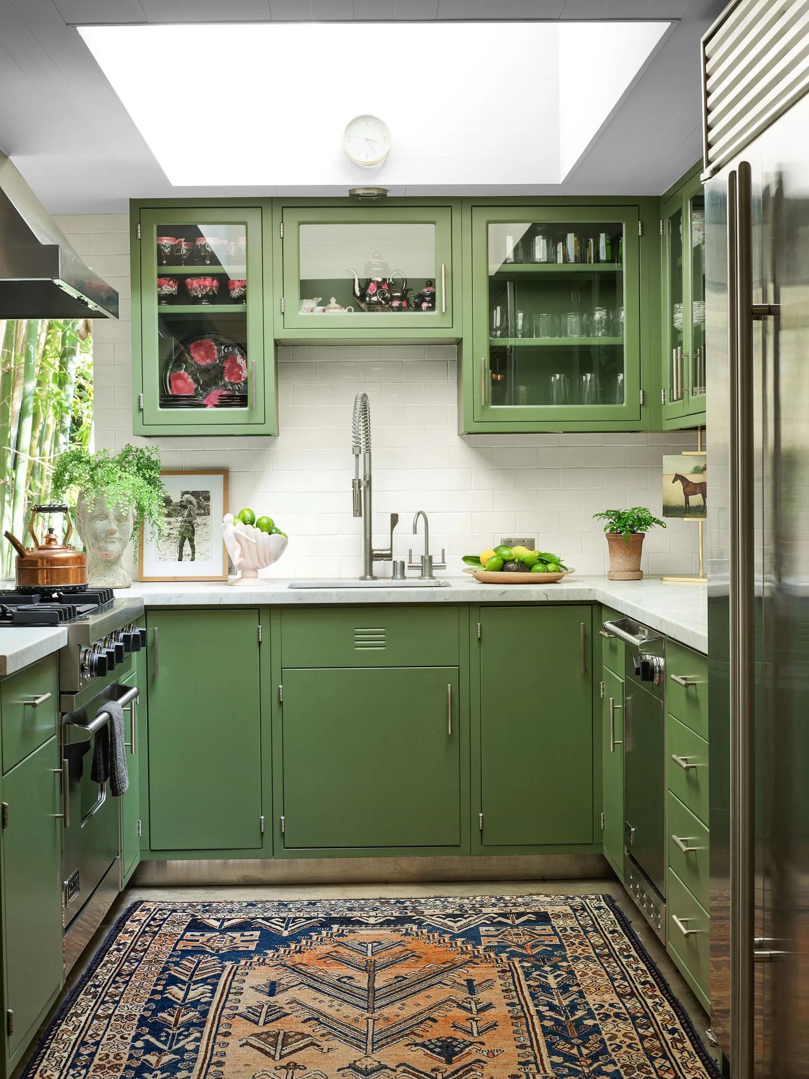 Trop explains how the colour is balanced: “The green is bold, but it stays controlled because the upper cabinets are glass-fronted, which stops the colour from overpowering the space.”