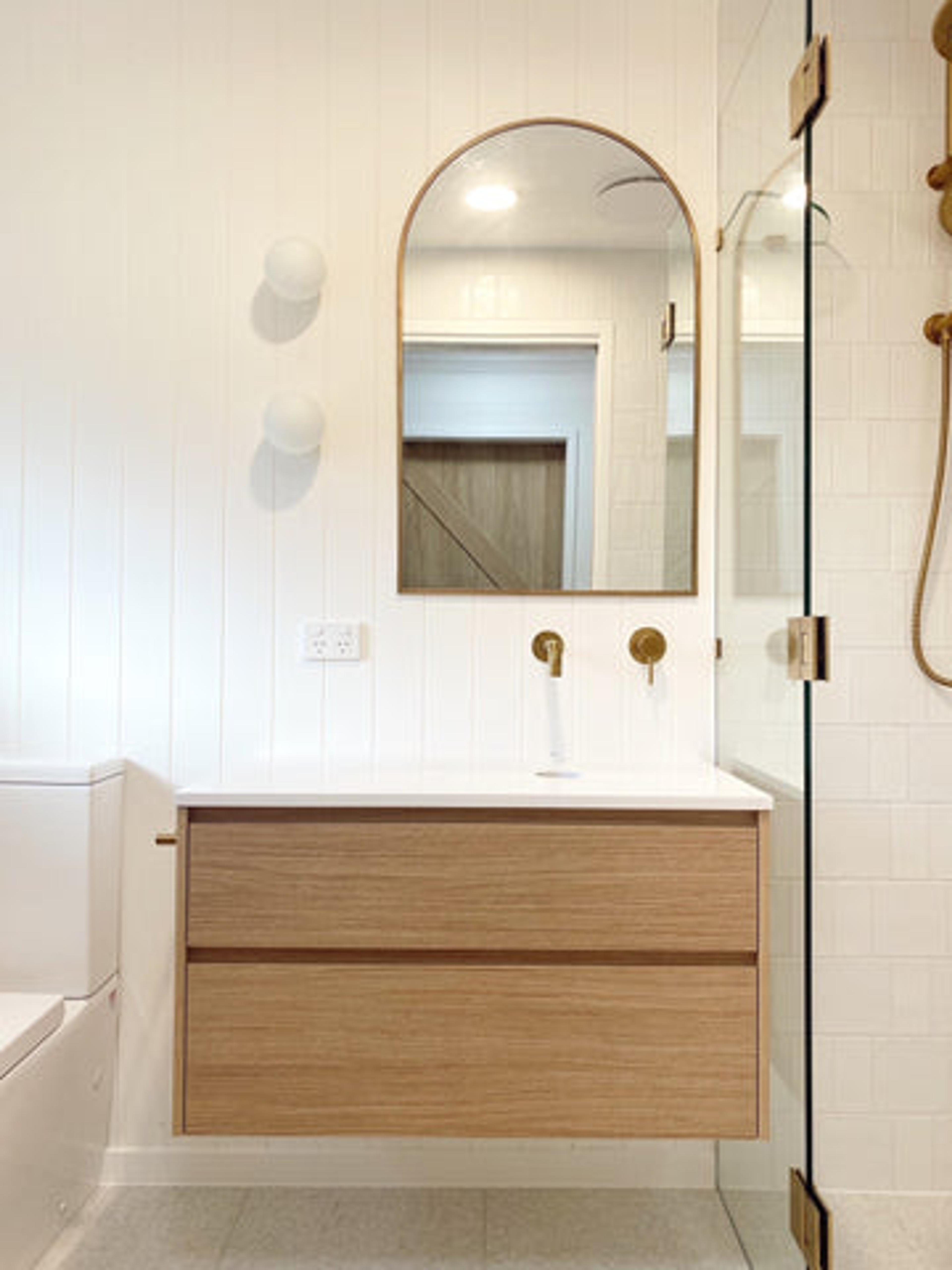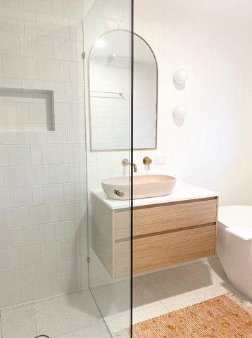 I tried to get organised early with supplies given the delays across all industries over the last year. I had to wait about 9 weeks for our concrete basins and about 6 weeks or so for the wall tiles we weren’t willing to compromise on (Newport pattern matt white). I then locked in a start date and schedule with our builder based on the ETA for those items. We had a very short 1 week delay with our tiler – first choice was on leave, second choice injured his back on another job, third choice completed the job but cost us $900 more and really dragged the process out (didn’t show up some days).