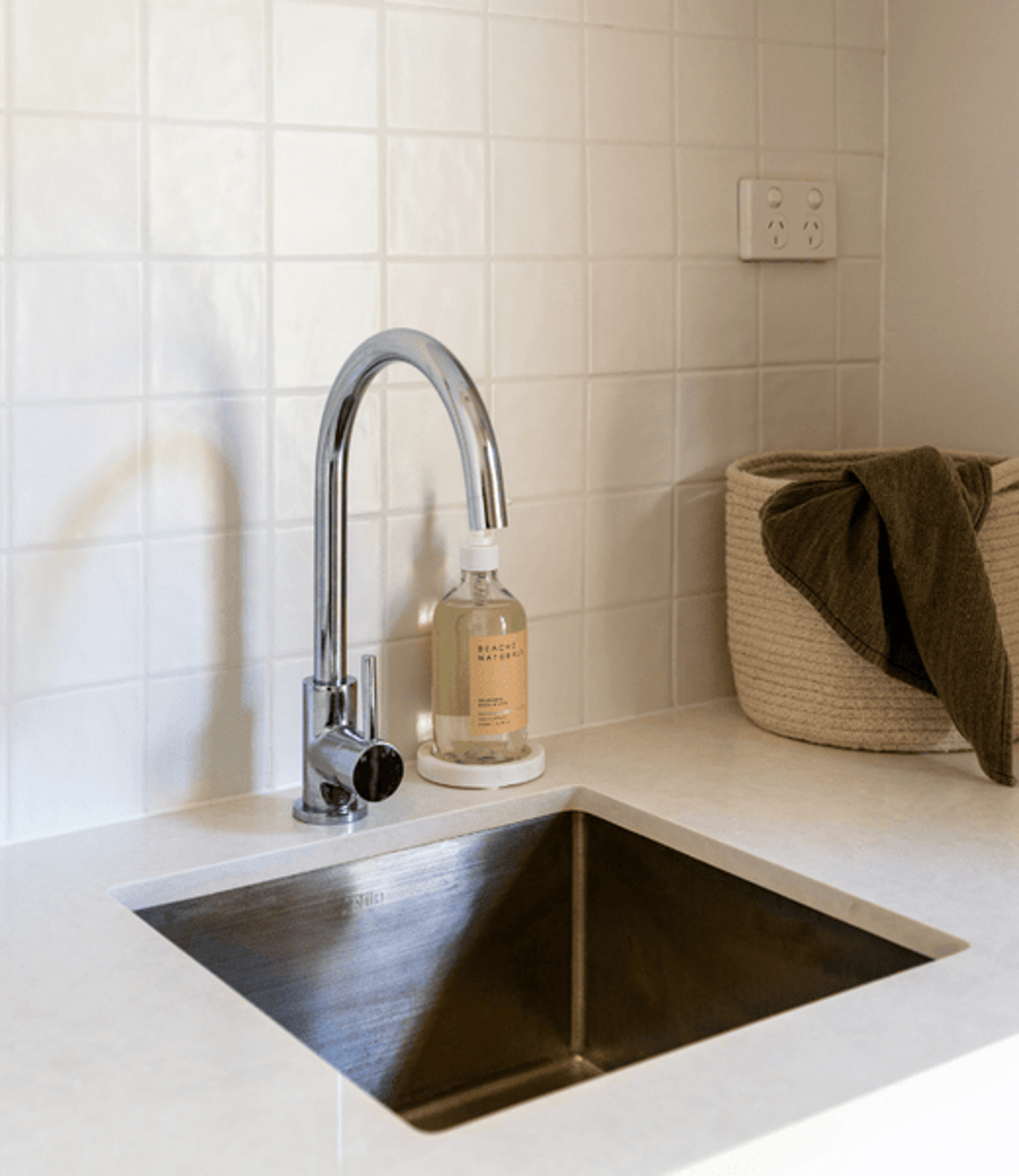 Materials matter too — stainless steel is durable and easy to clean, while ceramic offers a classic look but may be more prone to chipping. For a modern laundry design, composite sinks provide durability with designer appeal. TileCloud offers a range of quality basins, including a large farmhouse sink and a twin option. As well as a range of accessories to complete the look.