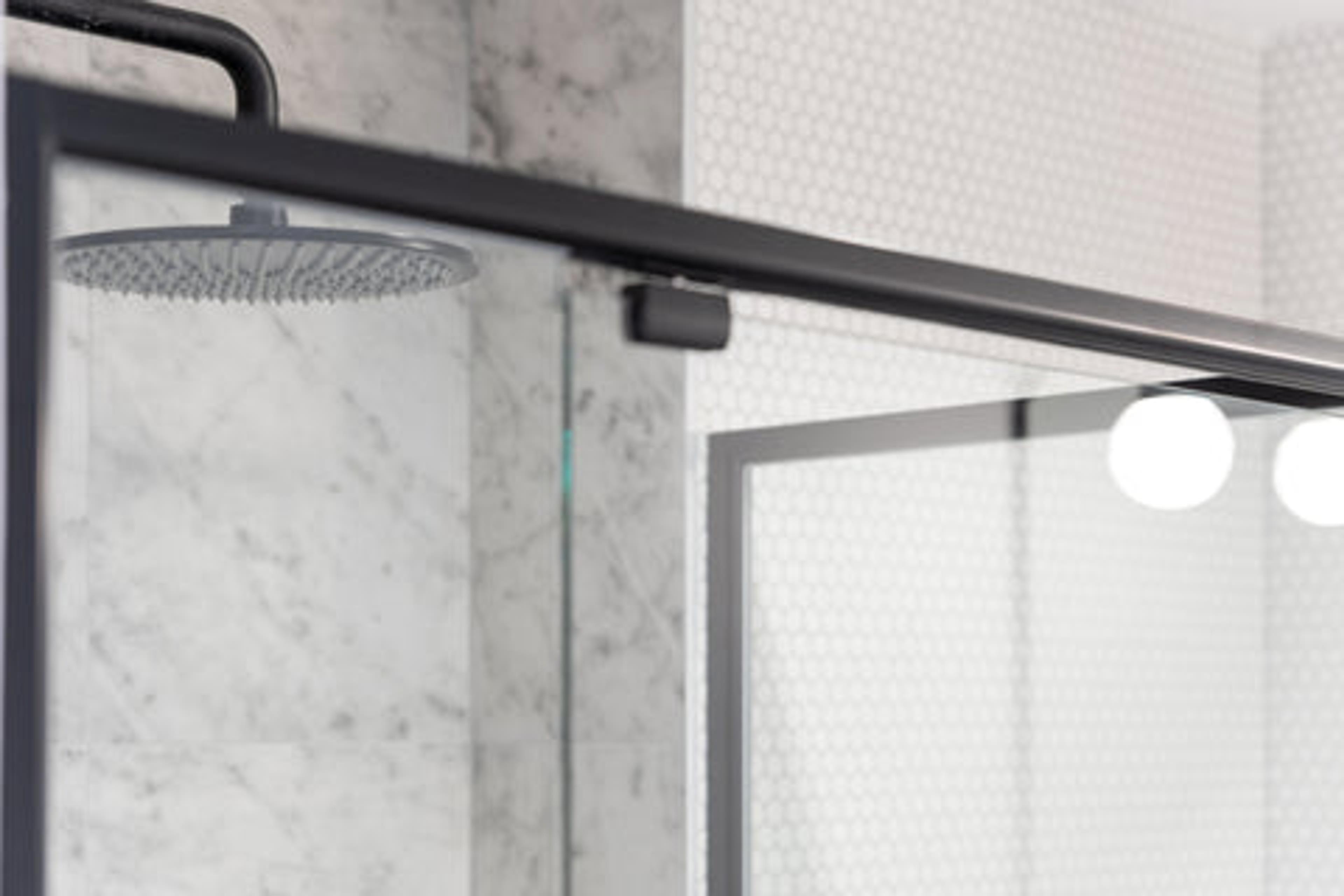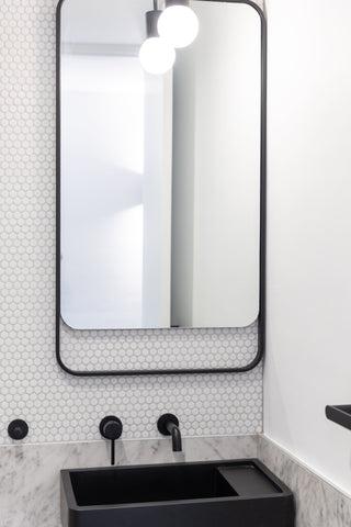 The black matte sink and detailed mirror make the best combo with the Potts Point Carrara look tile and the Broadwater Matt White Penny Round mosaic on the wall. We definitely knew in a small space like this that besides the feature tile choices, the tapware, and small details are the perfect opportunity to add some glitz and glam to the bathroom.
