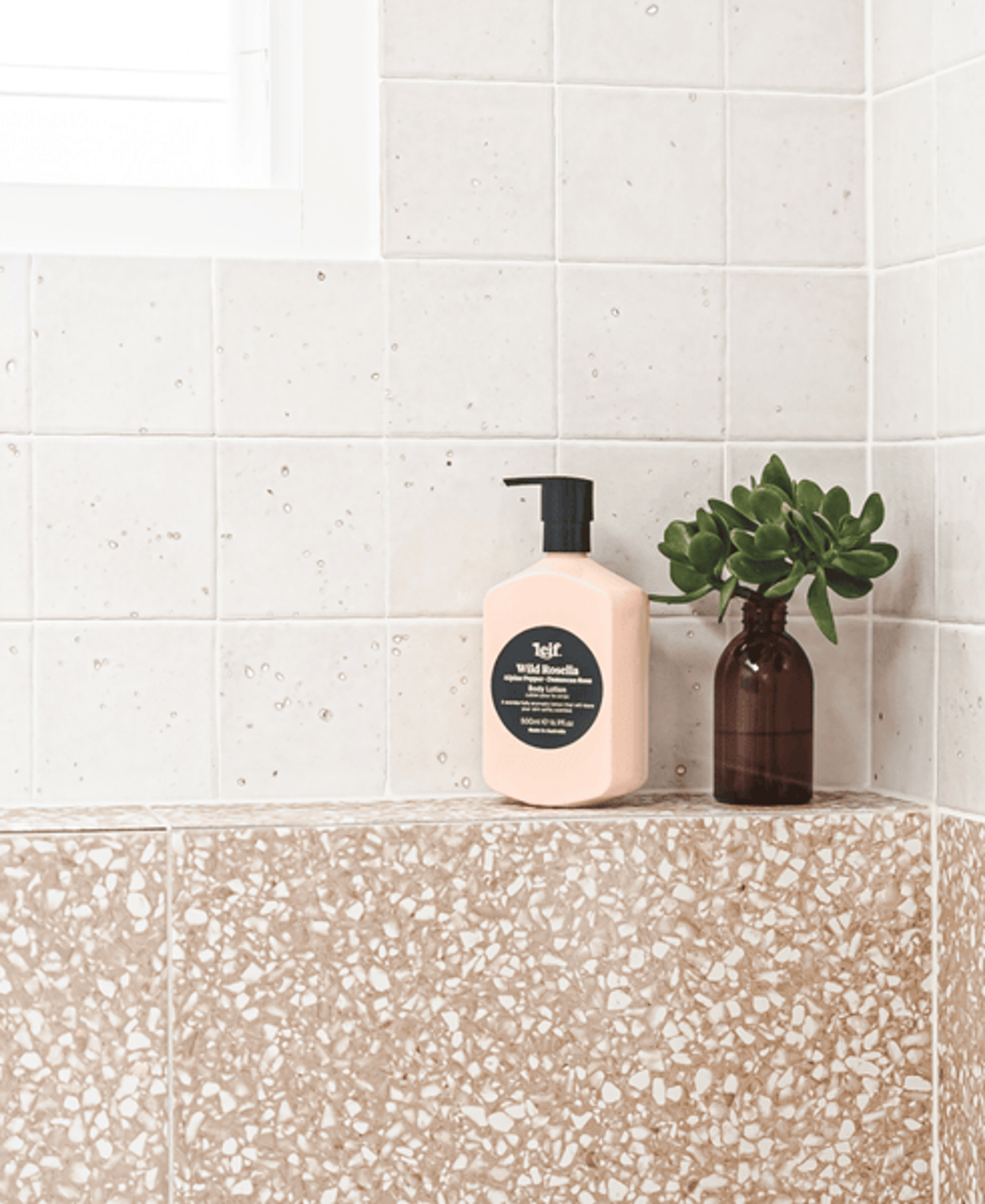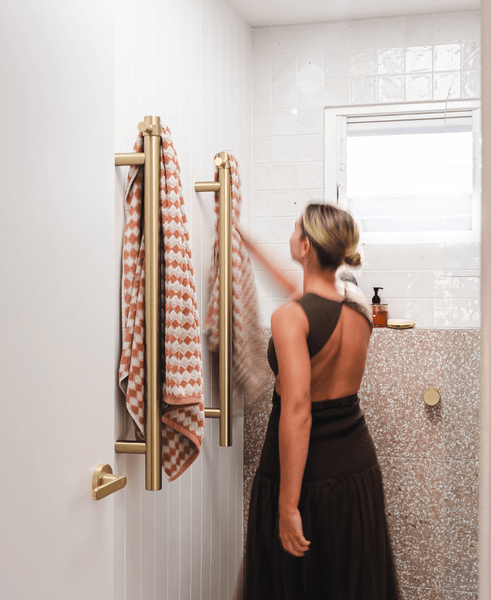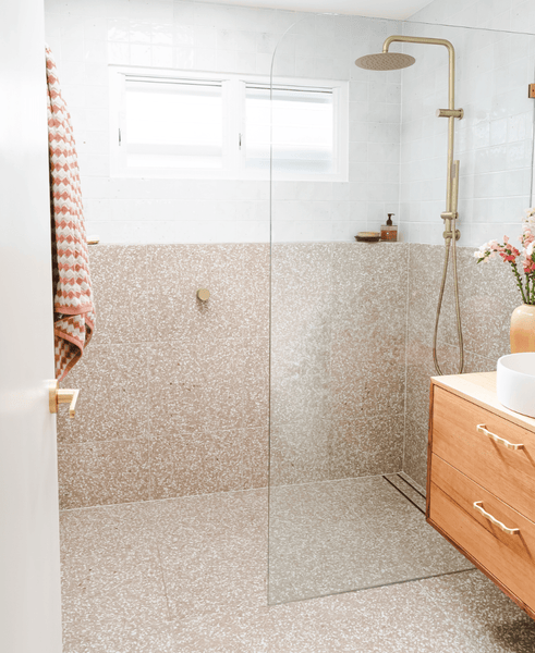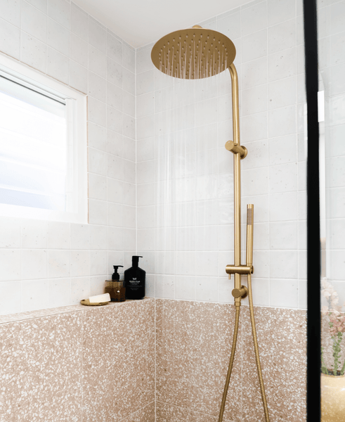 The couple ended up choosing the Umina White Gloss Small Square Tile for their shower walls, creating a clean, timeless look. They paired this with the beautiful Paddington Terracotta Terrazzo Look Tile for the floor, adding warmth and character to the space. To complete their bathroom design, they selected Yabby Brushed Brass Tapware, completes their look and complements the terracotta tones in their floor tiles.