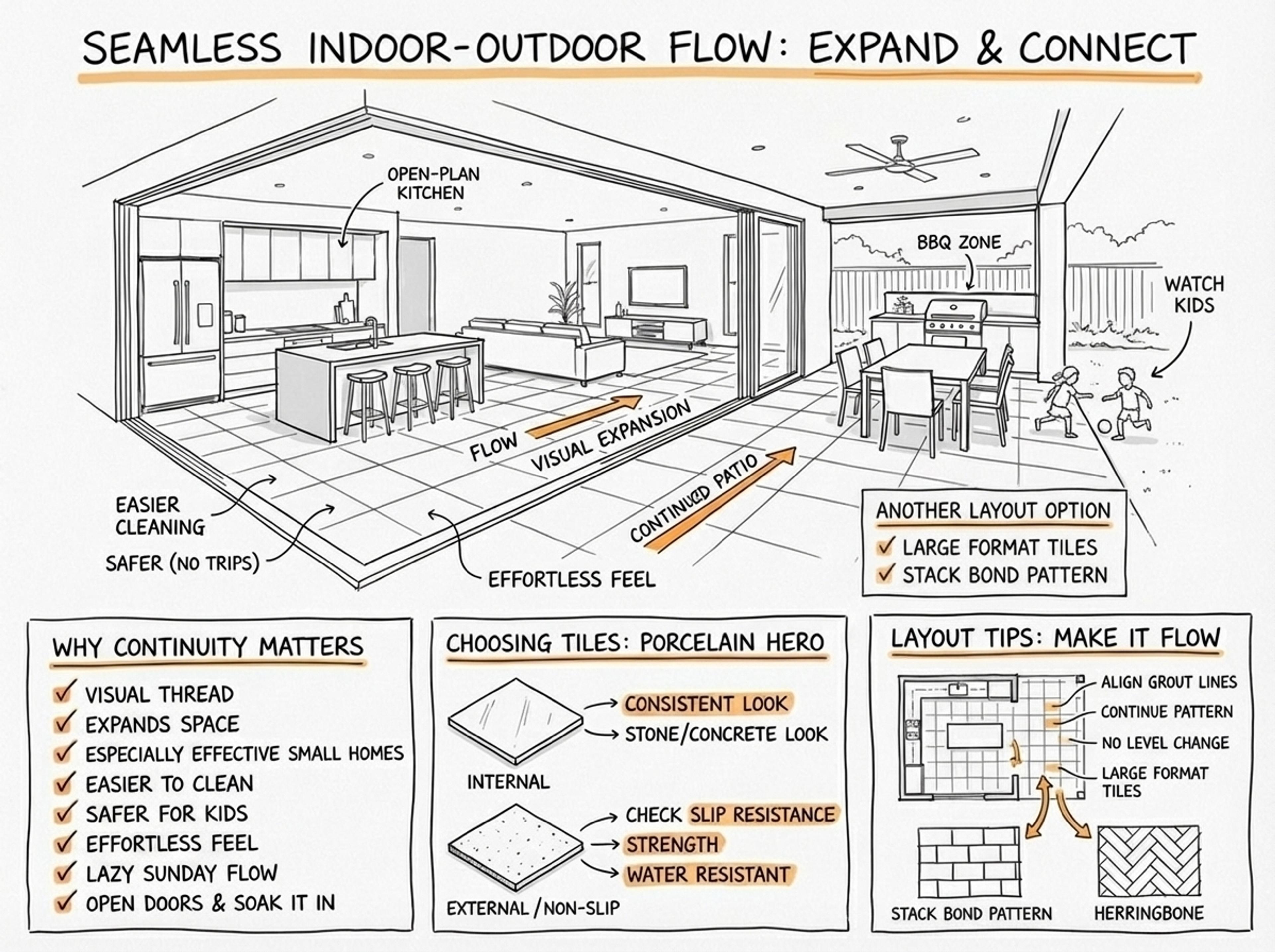The way you lay your tile can make or break your indoor-outdoor flow. Align your grout lines from room to room and continue the same laying pattern outside. For ultimate flow, if you can, ensure there’s no level change between internal floors and your patio. This is especially effective with bi-fold or sliding doors. Large format tiles help reduce visual interruptions and simplify the eye line. Love a little detail? Try a stack bond pattern that runs from your kitchen to alfresco, or take a herringbone from your hallway out to your BBQ zone. It’s these touches that make the space feel thoughtful and connected.