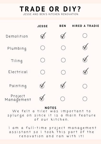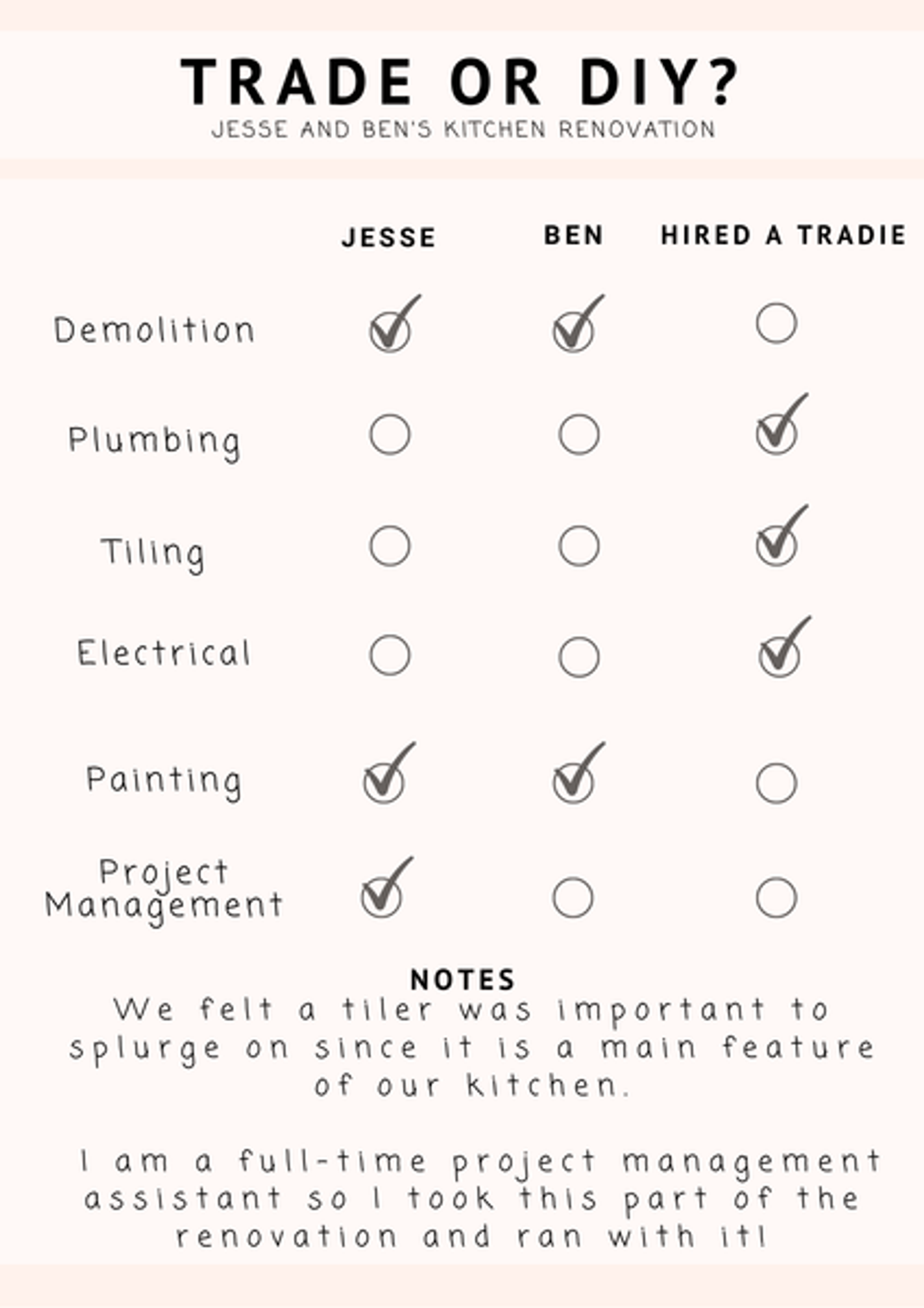 Write out an excel spreadsheet of absolutely everything and stick to it! Make sure you have a clear and concise design intent before starting otherwise it wont be consistent. I had everything I needed to get the finish I wanted saved for 1-2 months before renovating to think on the finishes selection to see if my taste changed. Eg. Do I still love this tile? Are we sure we want timber benchtops? Are Hampton style cabinetry going to date? Don't underestimate how much rubbish you accumulate... I felt like I was at the dump every weekend. And most importantly... have fun!