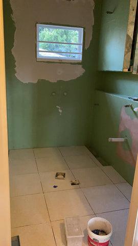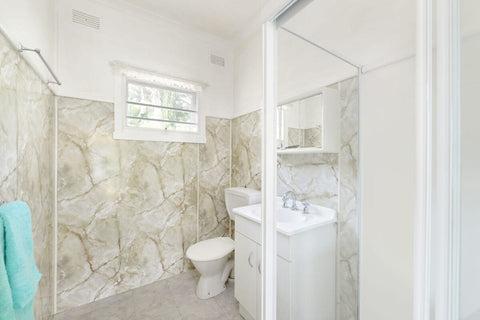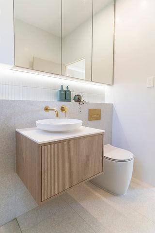 One issue that arose was that we wanted a half wall shelf to run the entire length of the bathroom to give us extra bench space and a shelf in the shower. This meant that for everything to line up, the shaving cabinet had to be slightly higher than we hoped and the tap and vanity had to be installed 30mm lower than we wanted which wasn’t ideal. Now that we are using the space, it isn’t noticeable at all.