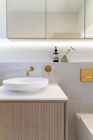 We had our hearts set on the Clifton vanity by ADP a couple of months before our house settled so everything kind of revolved around the vanity. The vanity actually set the style for the entire house, inside and out! We knew we wanted to use brass tap ware and that our palette needed to be appealing to a broad market for resale so we decided to go light and bright for tiles, flooring and paint.