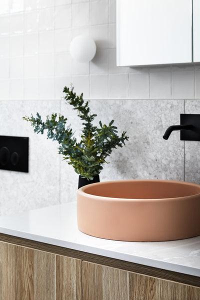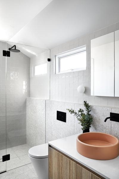 Don't try and be too ambitious overall, focus on 1 or 2 key elements in each room as the stand-out feature/s. For the family bathroom the highlight is the gloss subway tiles that we used on 2 feature walls. We laid them vertically to draw your eye up to the skylight. In the ensuite, it's the 100mm x 100mm square tiles for the 2 feature walls and the Nood Concrete basin in peach.
