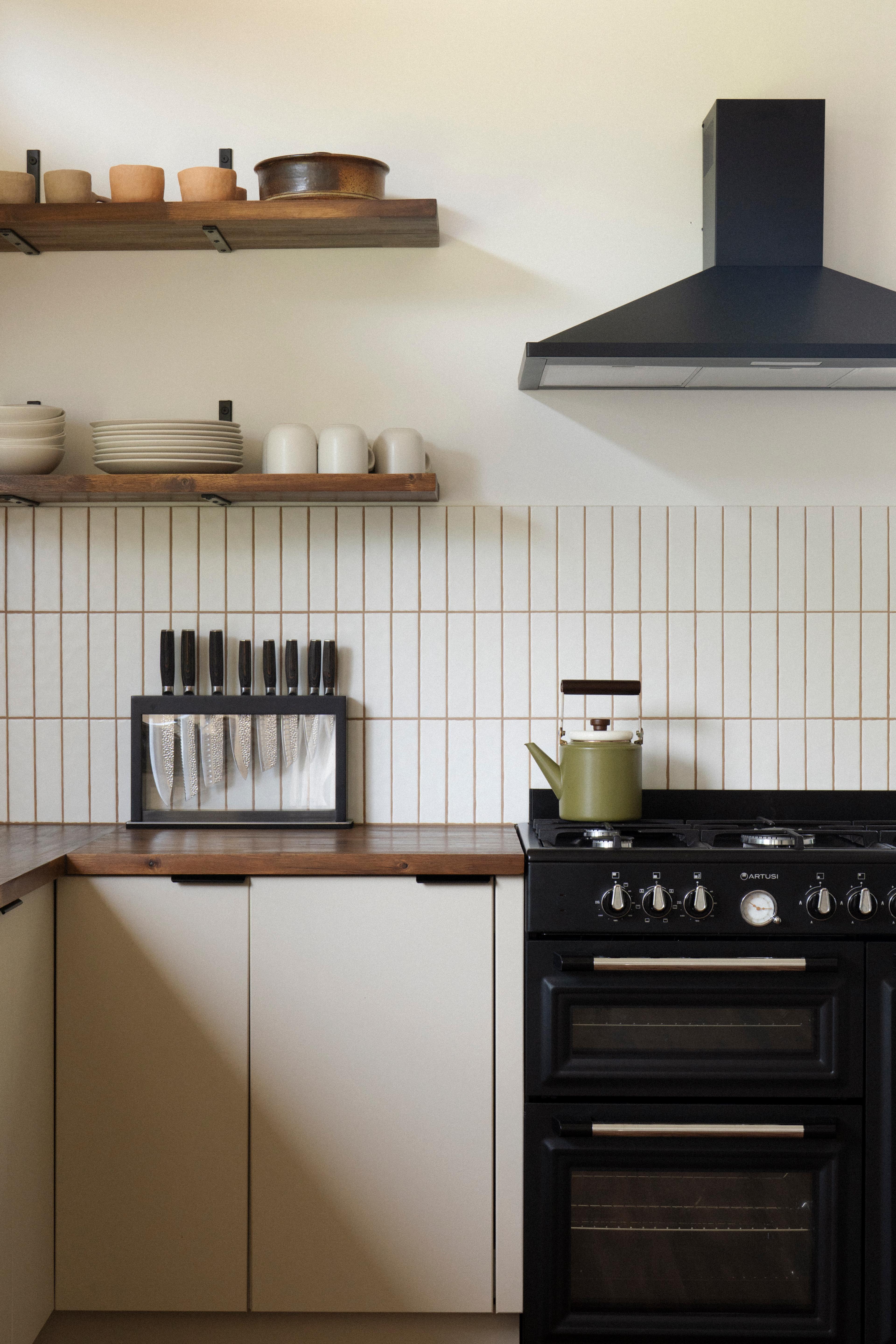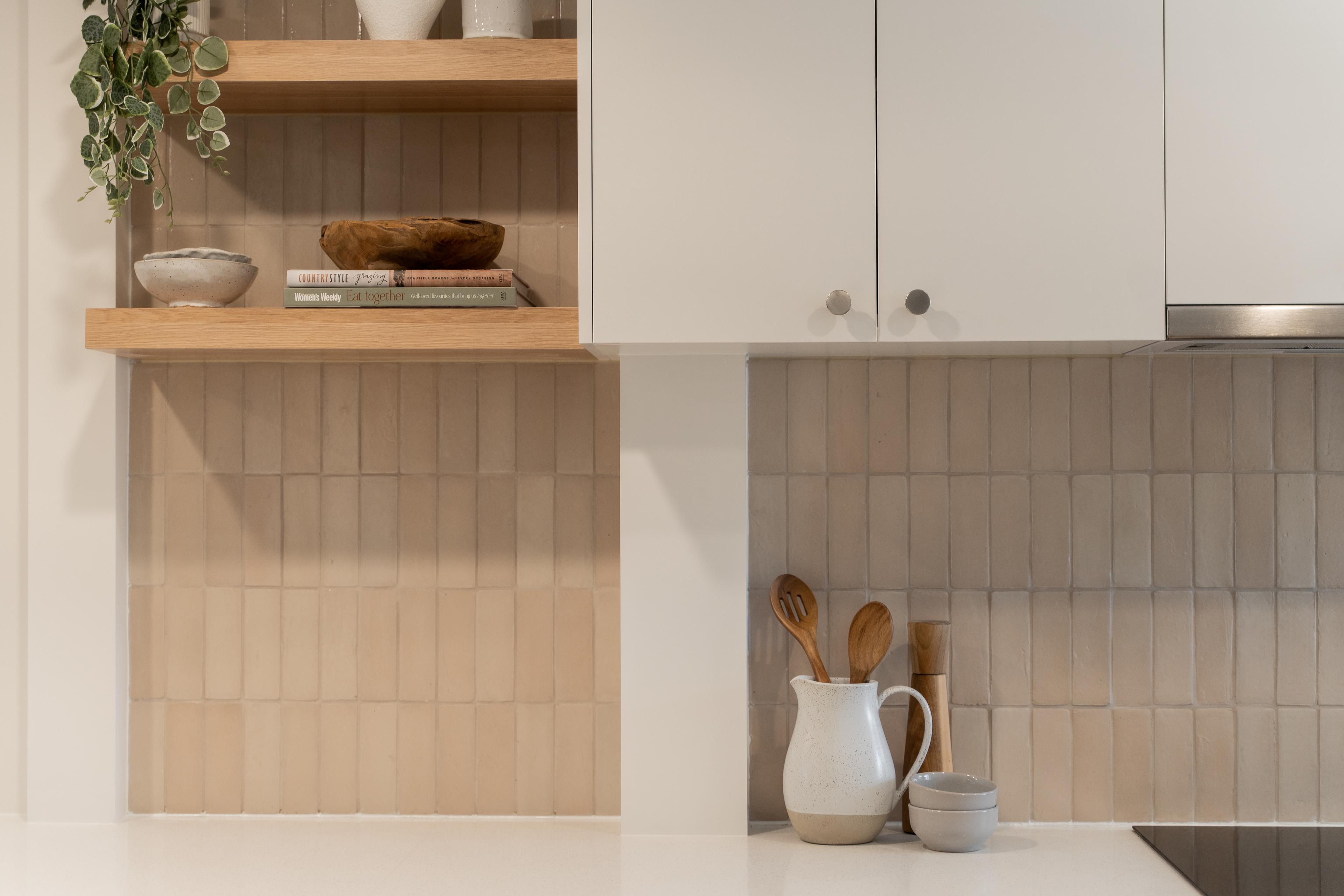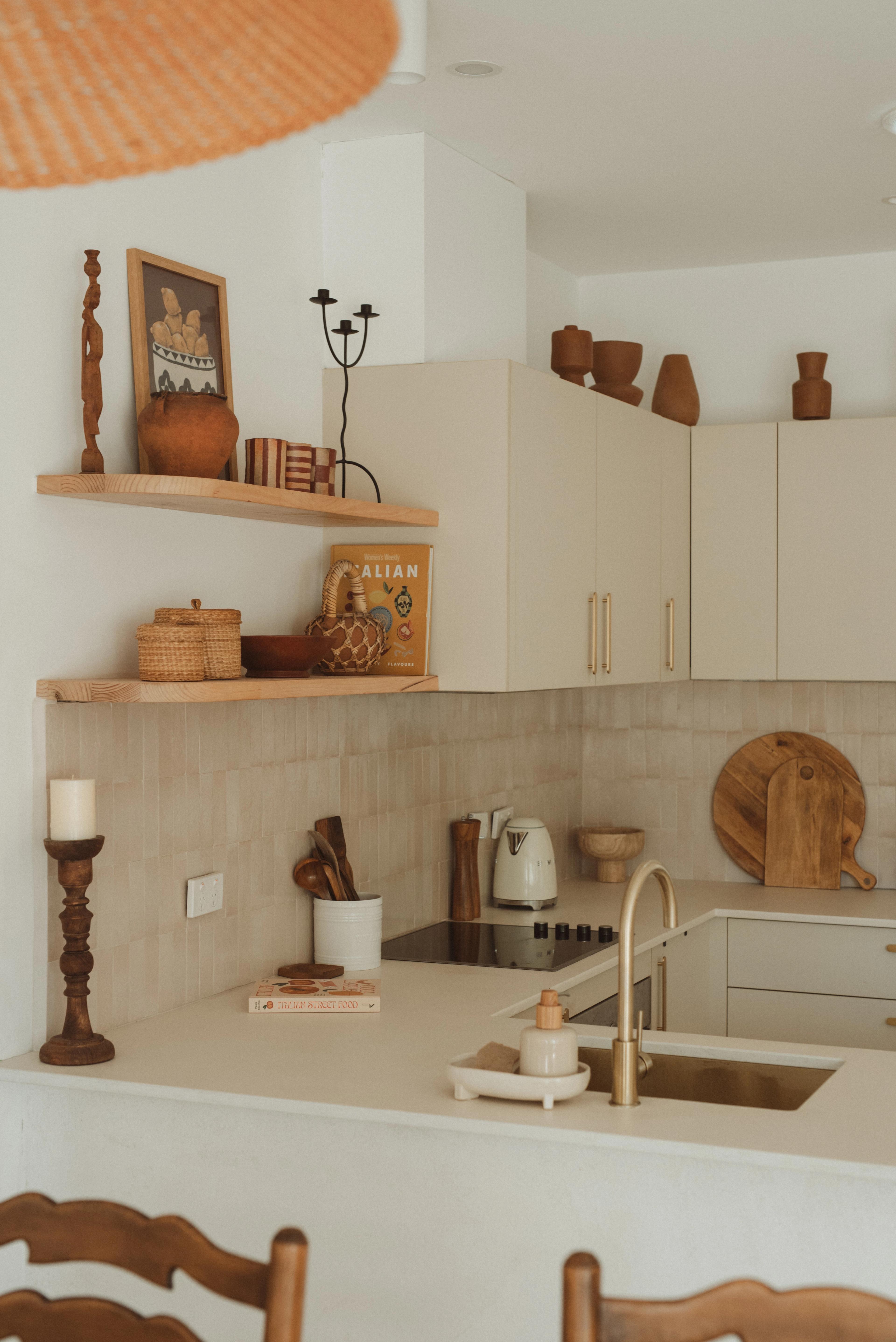 A mid-century modern kitchen focuses on function over fluff, with a simple layout and intentional decoration to keep things clutter-free. Pair a clean base palette with a coloured splashback, using mid-century staple colours like lively greens, browns and mustard yellows. Open shelving breaks up heavy cabinetry and gives you space to display fun pieces while staying tidy.
