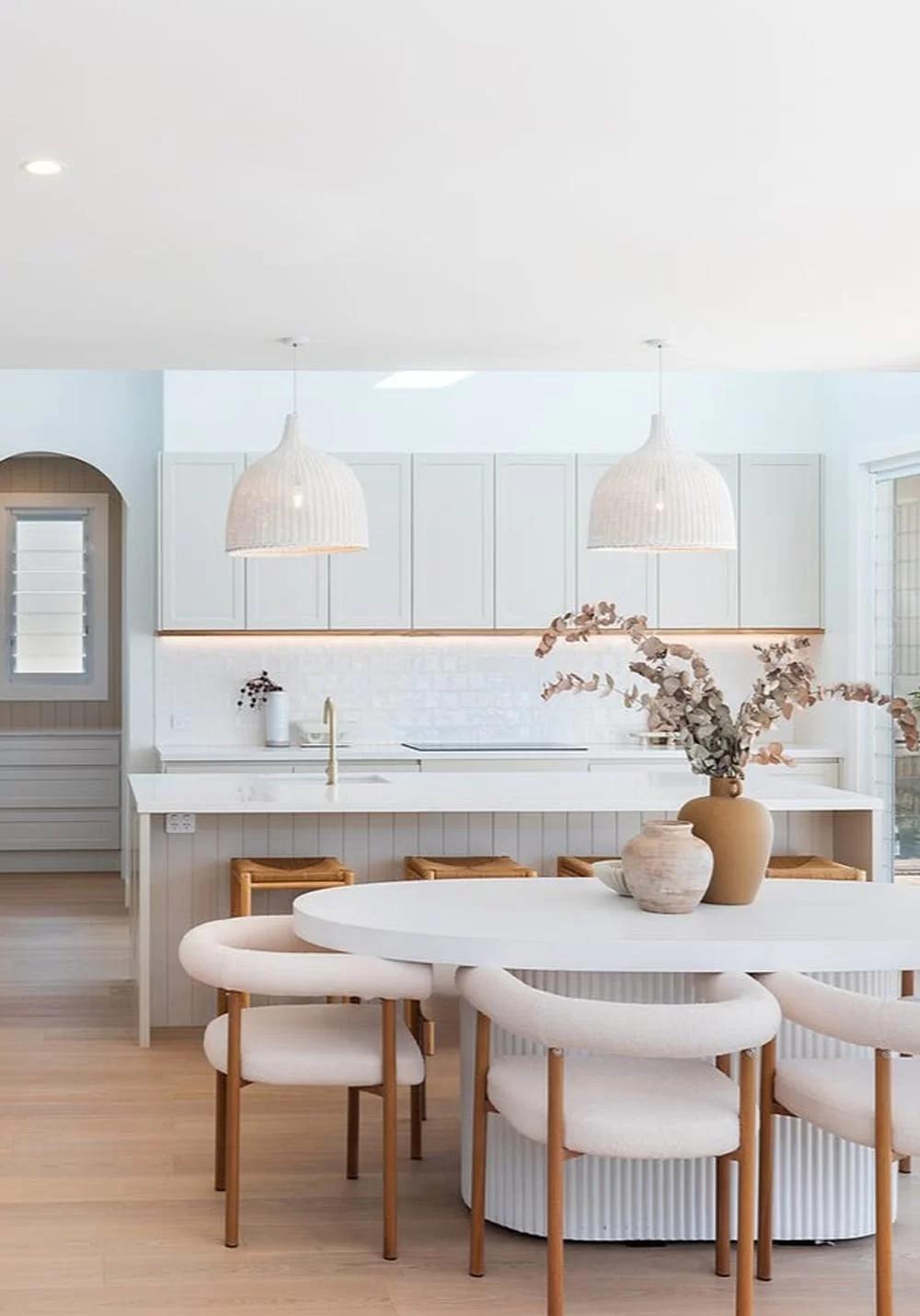 Coastal kitchens often use light colours, timber and textures to bring a relaxed feel. You could stick to breezy whites and sandy tones, with natural light and open layouts. Add plants or rattan details for that fresh, airy vibe.