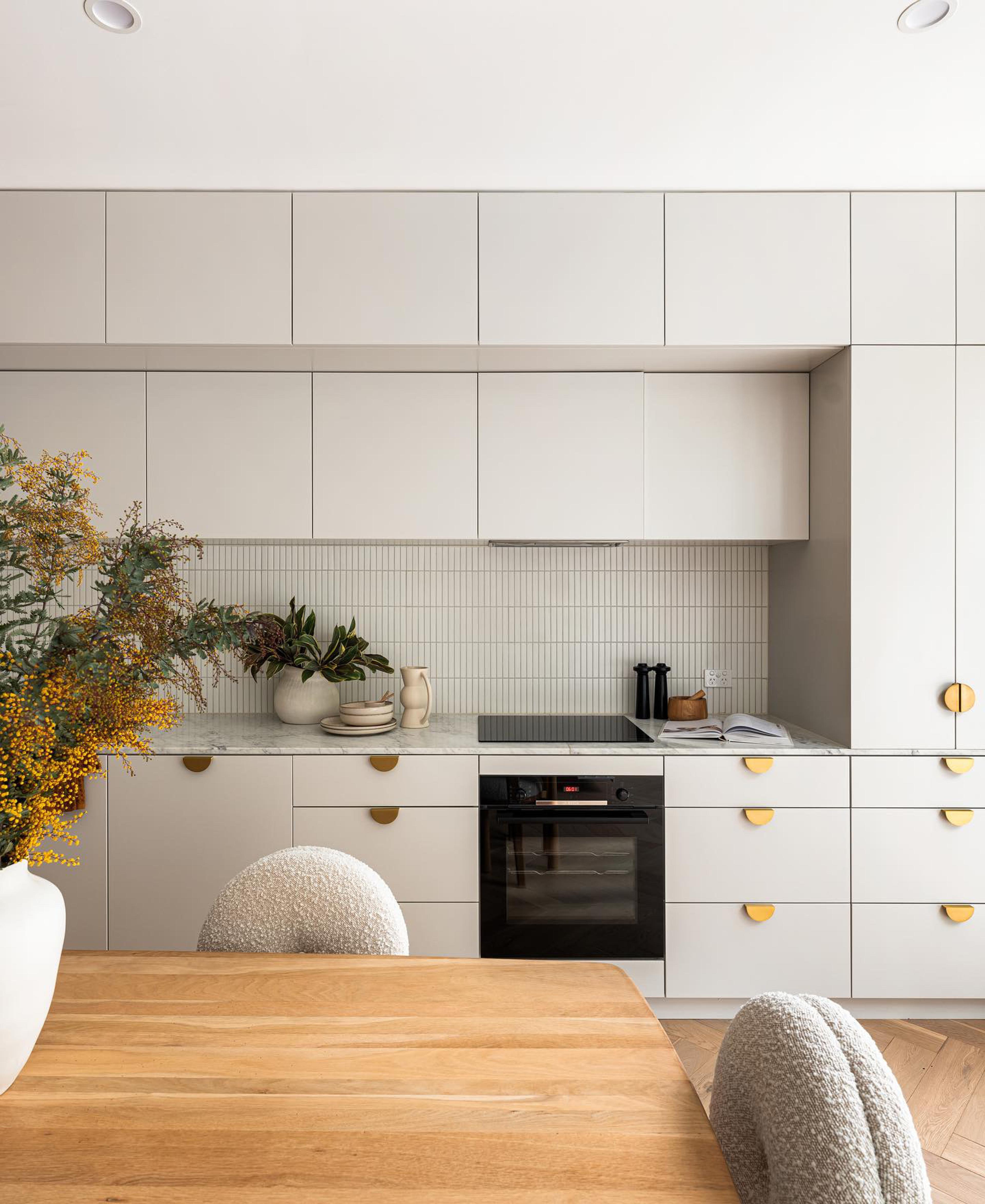 Minimalist light kitchens keep things fresh and airy. Focus on practicality, simple layouts and smart storage to keep surfaces clean and easier to use. Adding subtle textures like timber accents or a stone benchtop can give a more homely look without extra clutter.