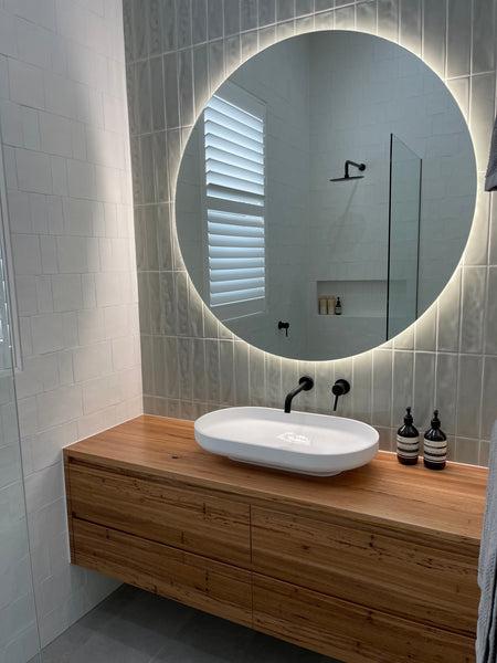 The laundry tiles were a bit of a process to get them right but we got there in the end. Fortunately for us the tiler used the wrong colour grout so it gave us the opportunity to go even darker than we had originally wanted...Initially white grout was used, when we actually wanted to use moon white, a very light grey. We put some grout on some sticky tape to work out if it was white or moon white. The tiler removed the white grout and re-grouted with moon white over the top. There was some damage in the process and the new grout sat too high and almost flush with the tiles. As we weren’t happy with the finish, the tiles were then completely stripped back and re applied from scratch. We then decided to use Manhattan grey grout to give more definition to the individual tiles. We are very happy with the end result. Also waiting for Tom to finish the LED lights around the round mirrors for the ensuite and the bathroom, haha. I just couldn’t wait for them to go up!