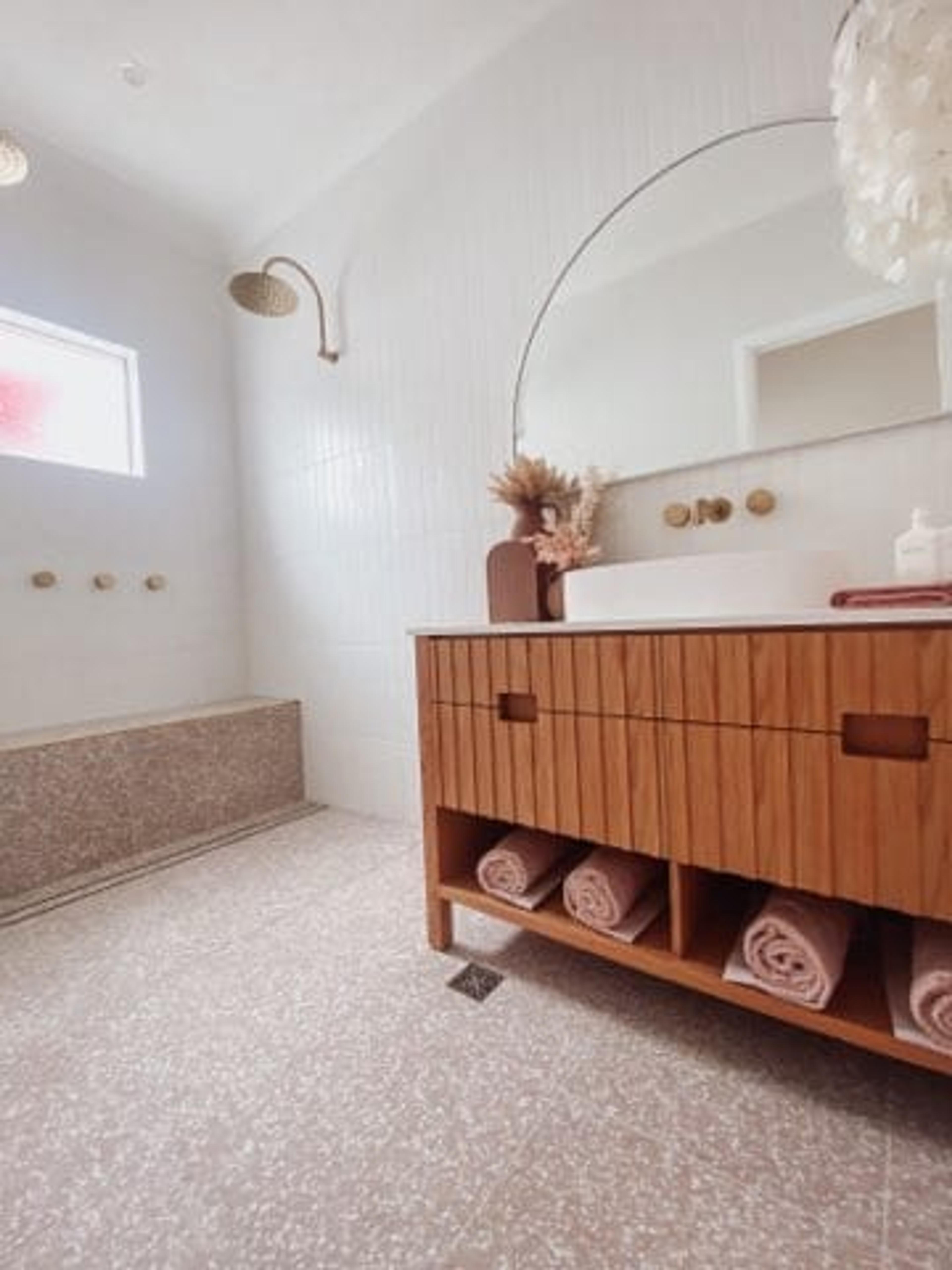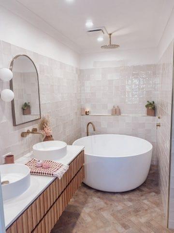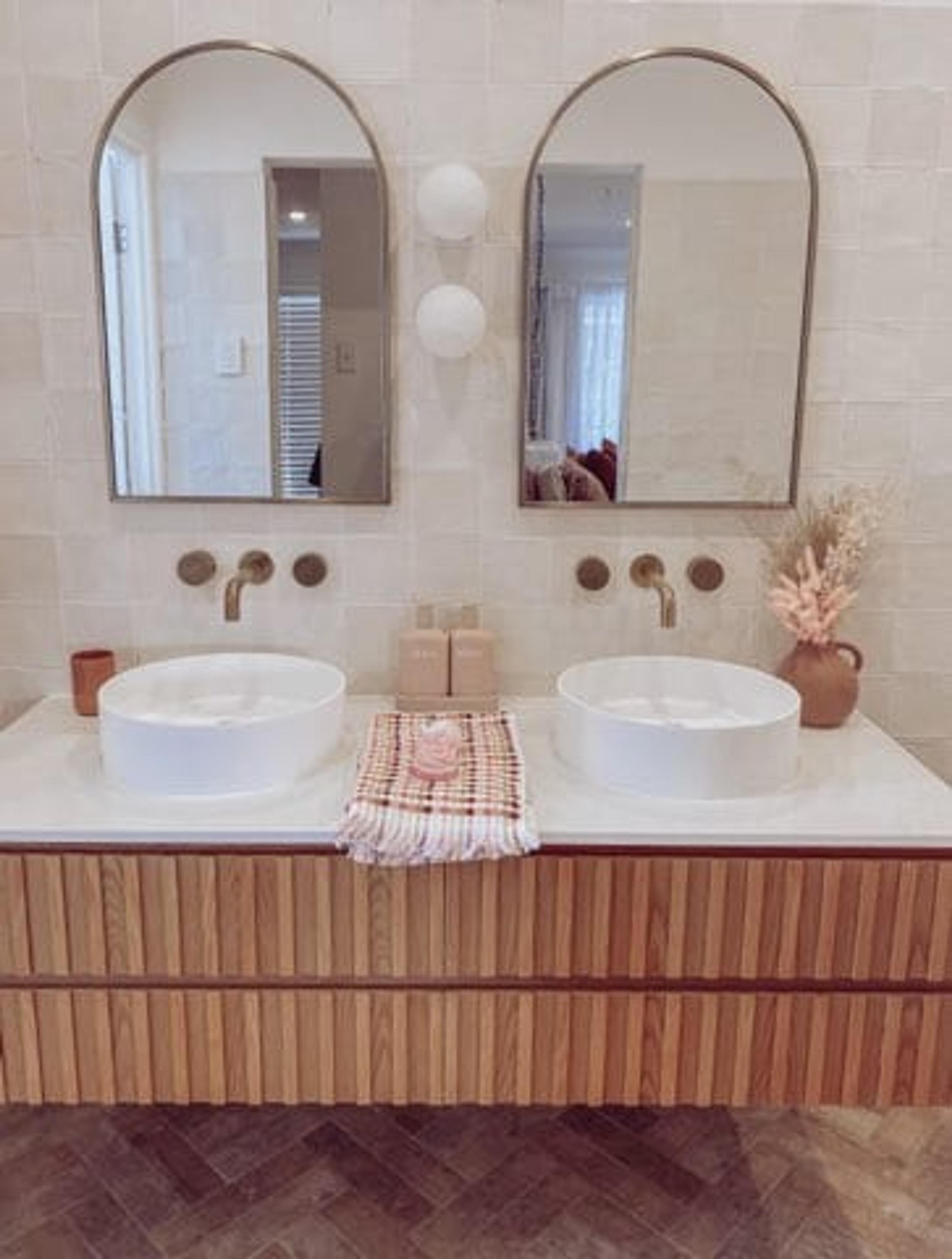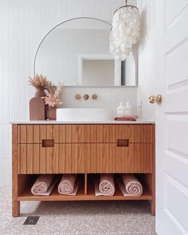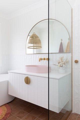 The starting point for me was tiles. I was obsessed with the Thirroul Terracotta tiles. They were my starting point and everything flowed from there. I wanted that real terracotta earthy vibe for my bathrooms, a space that was calming and relaxing. I wanted to create 3 spaces that felt like their own unique room with a day spa feel. A place to relax and hide from the world.
