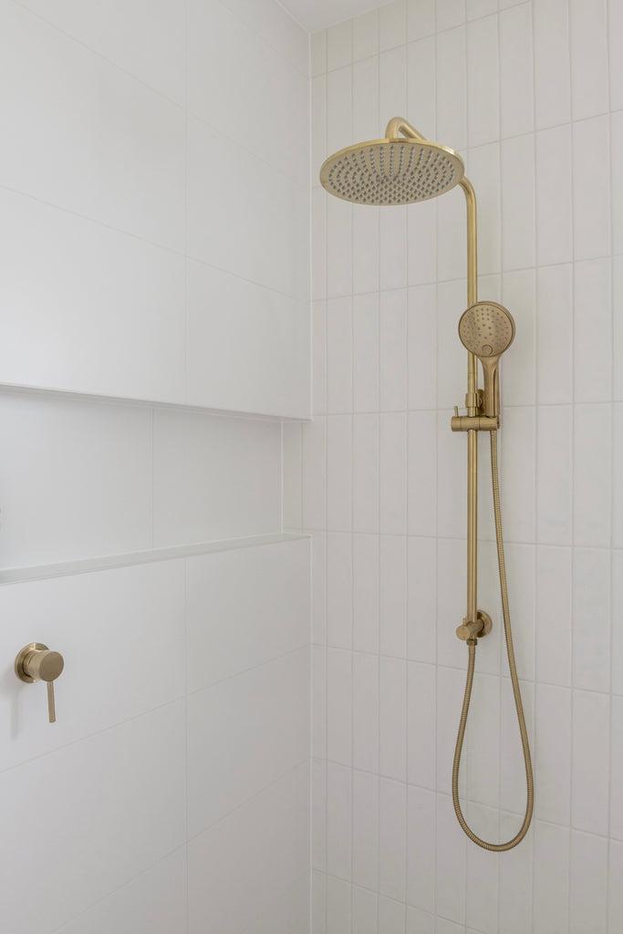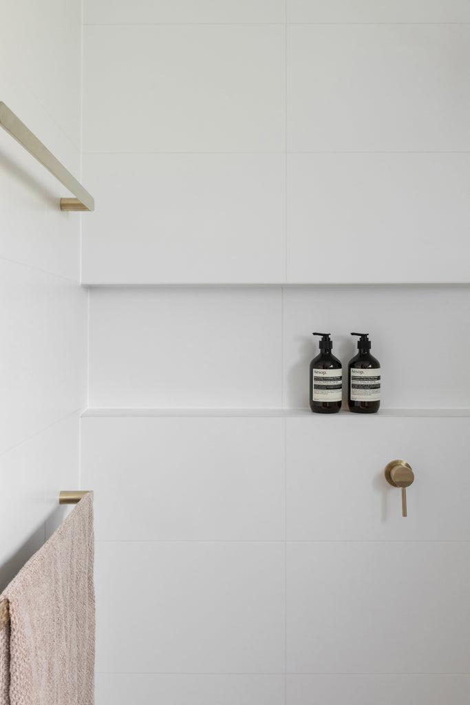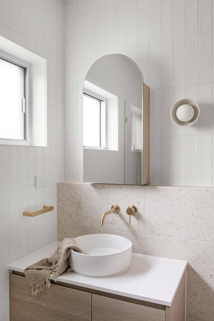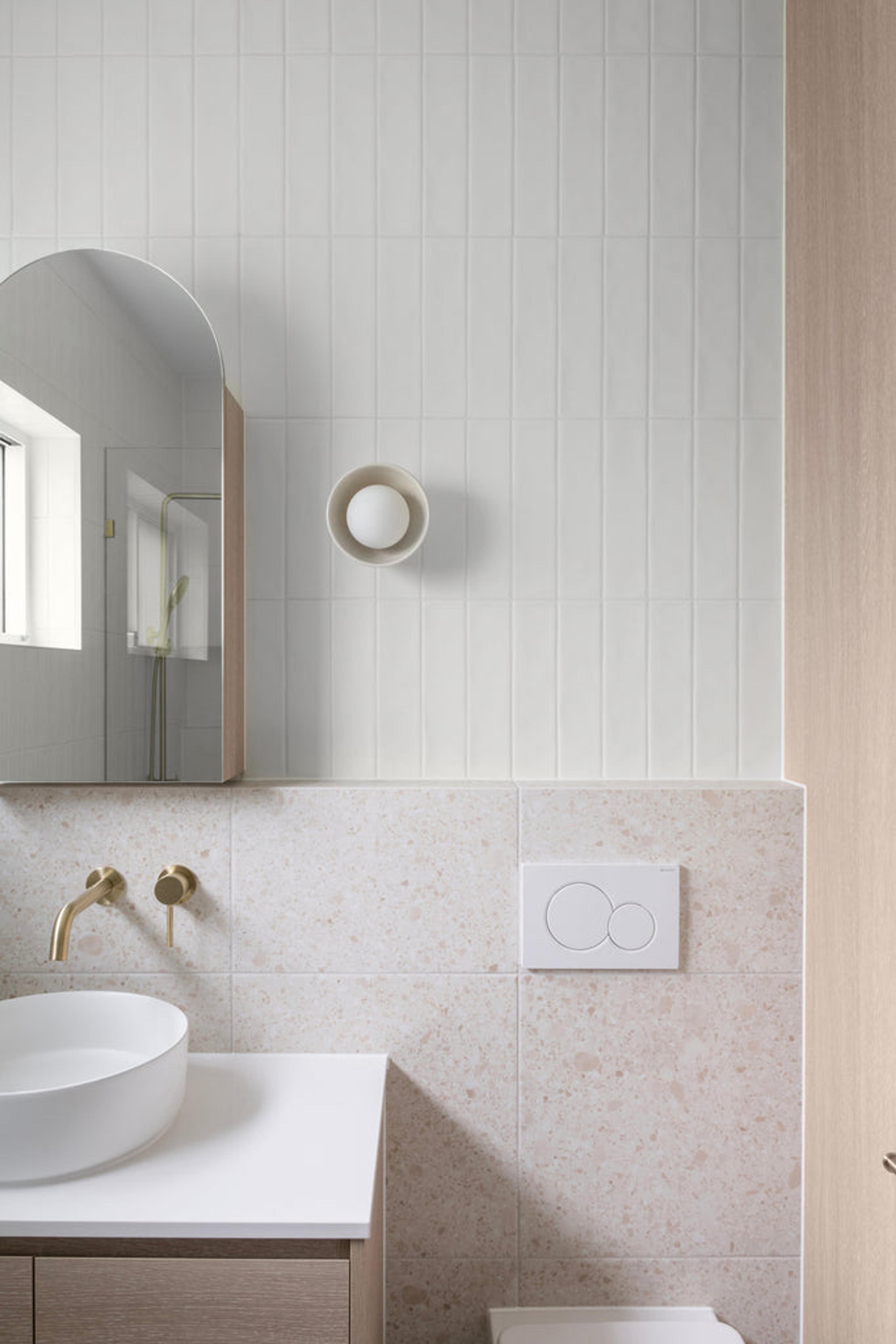Using our Yamba Clay Terrazzo Look Tiles & Newport Matte White Subway and Brushgrove Matte White Tiles creating a light and calming space through the use of warm neutral tones and textures.