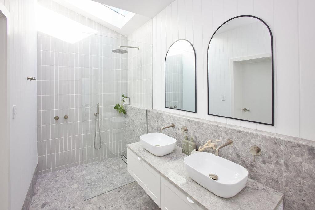 Project by PB Bathrooms Adelaide | Photography by Sebastian Paynter | Stirling Grey Terrazzo Look Tile and Riverton Matte Grey Subway Tile