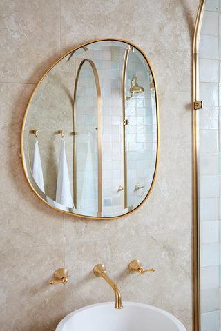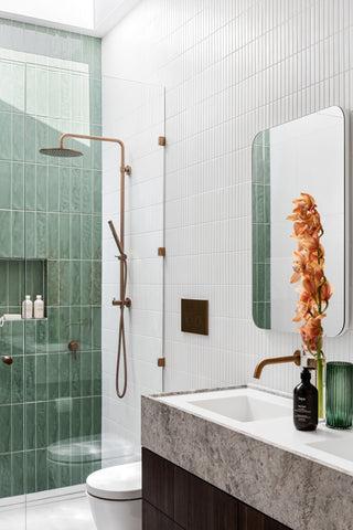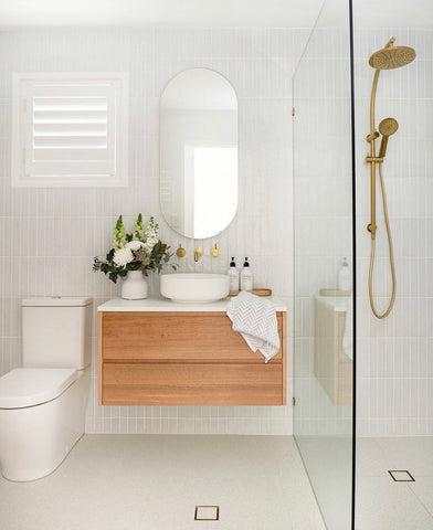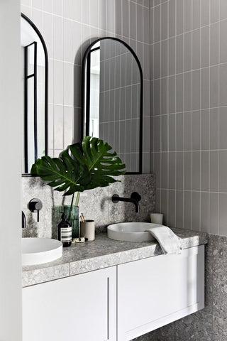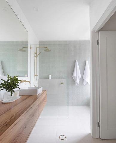 My dream bathroom would have our Paddington in white terrazzo tile everywhere with one feature wall full of the Albert Park Full white tile. Paired with brushed brass tapware and light oak timber vanity, with a white stone stop and a handmade white stone basin. Lots of plants and textured towels to bring it all together.