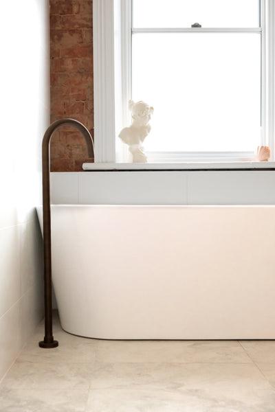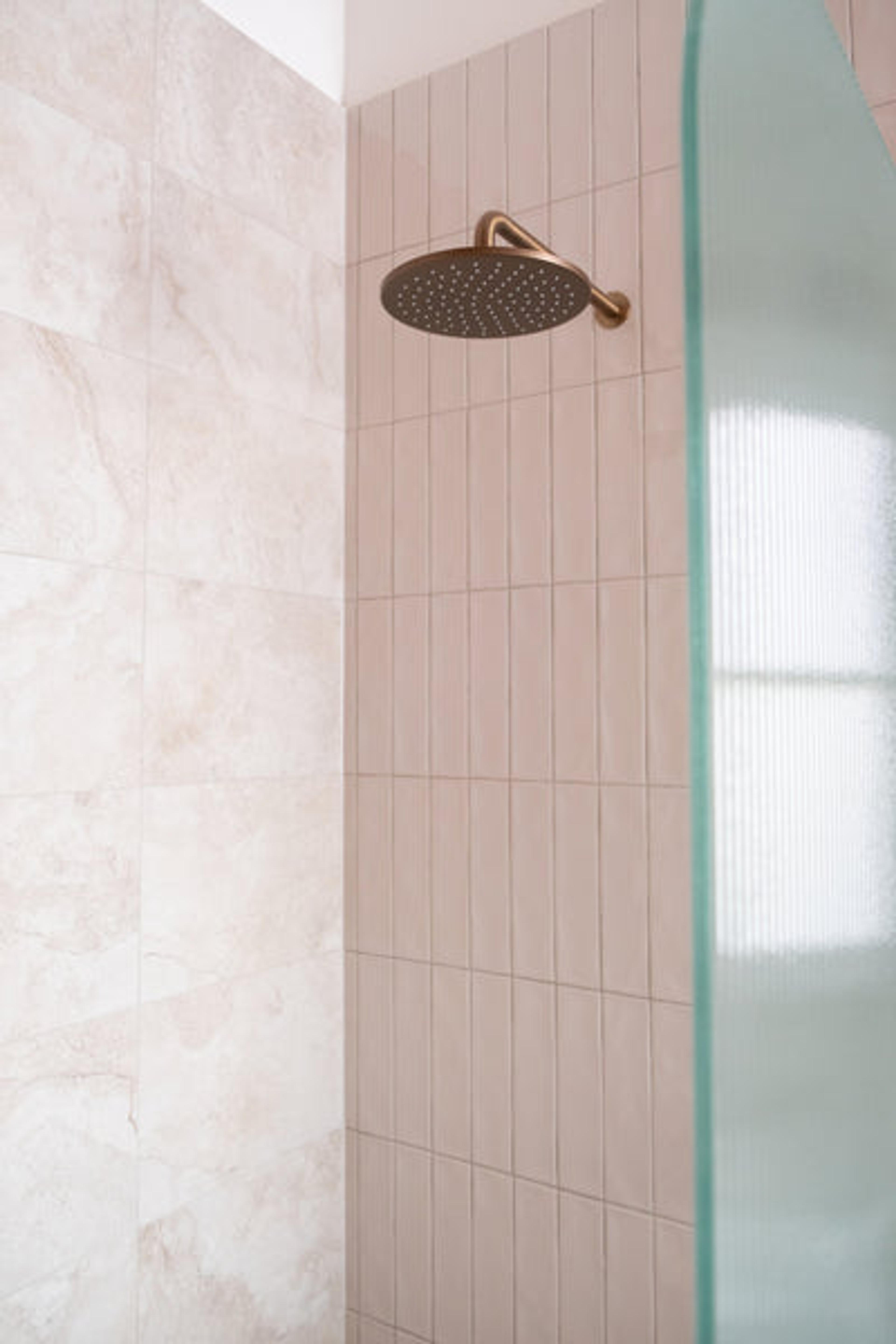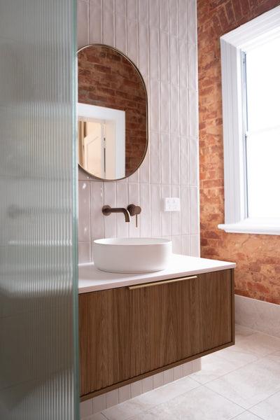 Depending on the rooms (they’re all unique!), Thirroul Bone Matte Subway Tiles or Newport Gloss Subway Bone Tiles were used for the bathroom walls to complement the exposed brick walls that remained.