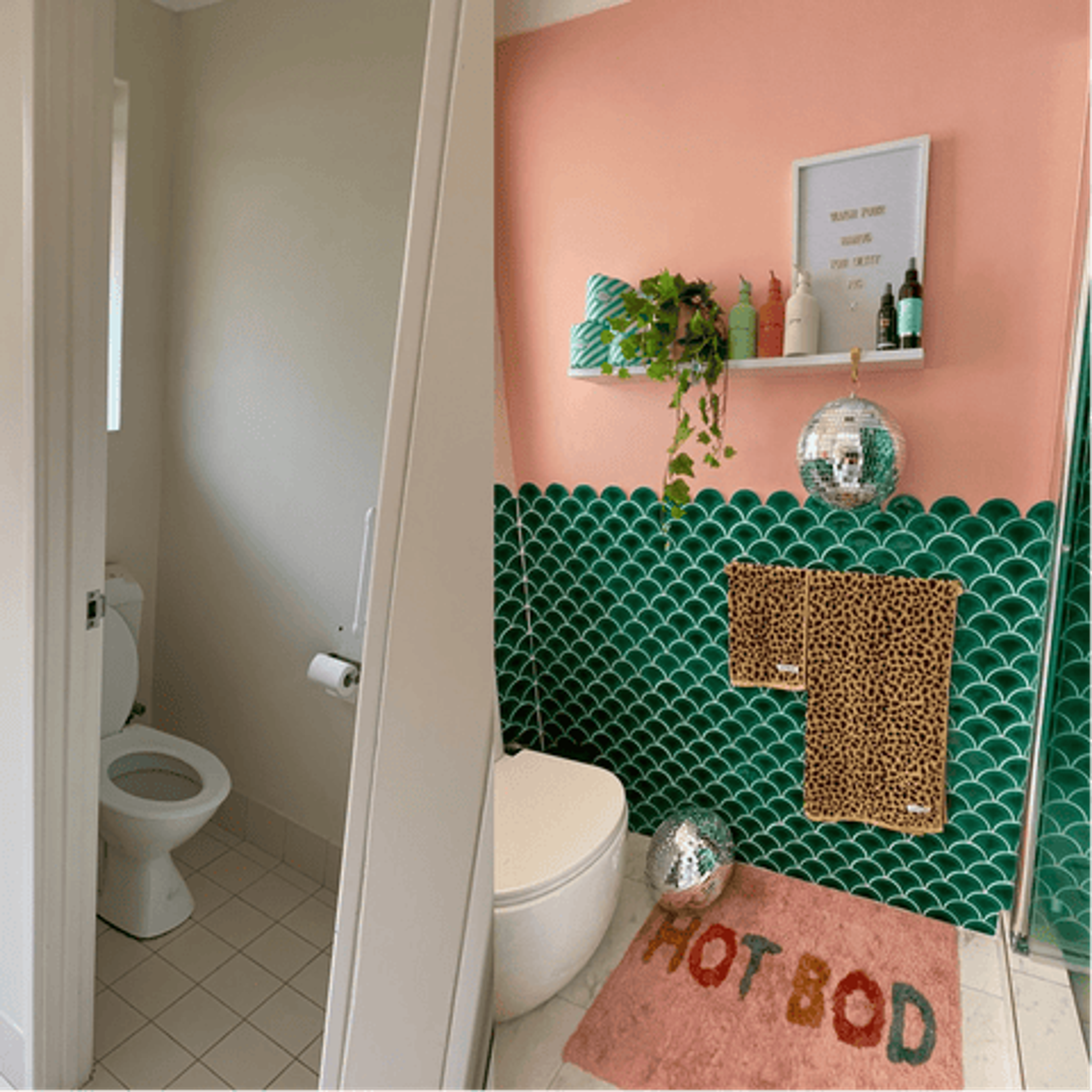 Becca from The Bungalow Up created this fun, eclectic bathroom design using our Mornington Limestone look ivory tile (currently unavailable, check out our Byron Travertine look ivory tile as an alternative) paired with the Coral Bay gloss Teal Fish Scale tile for a beautifully unique space.