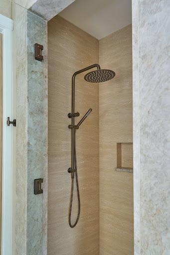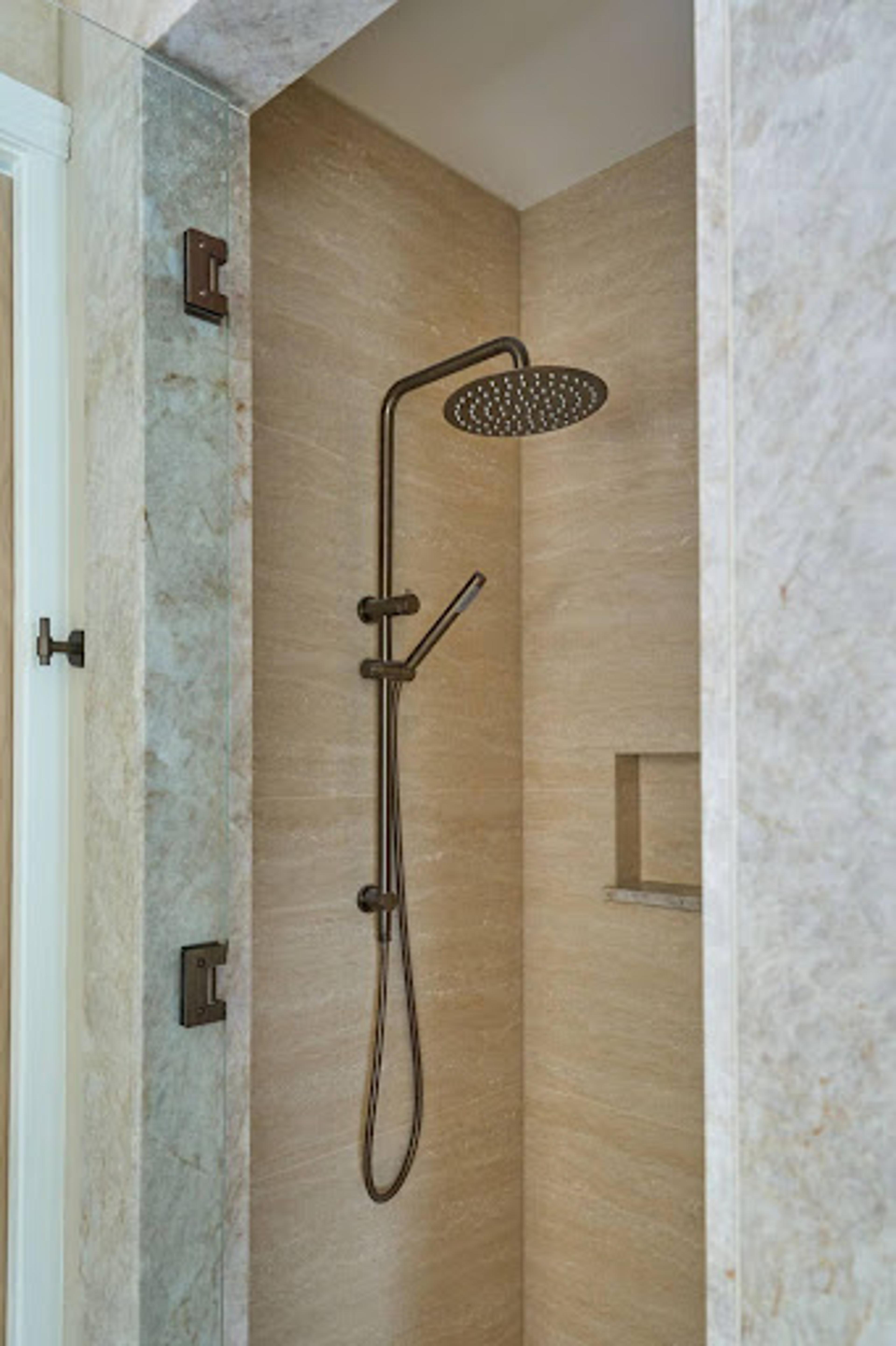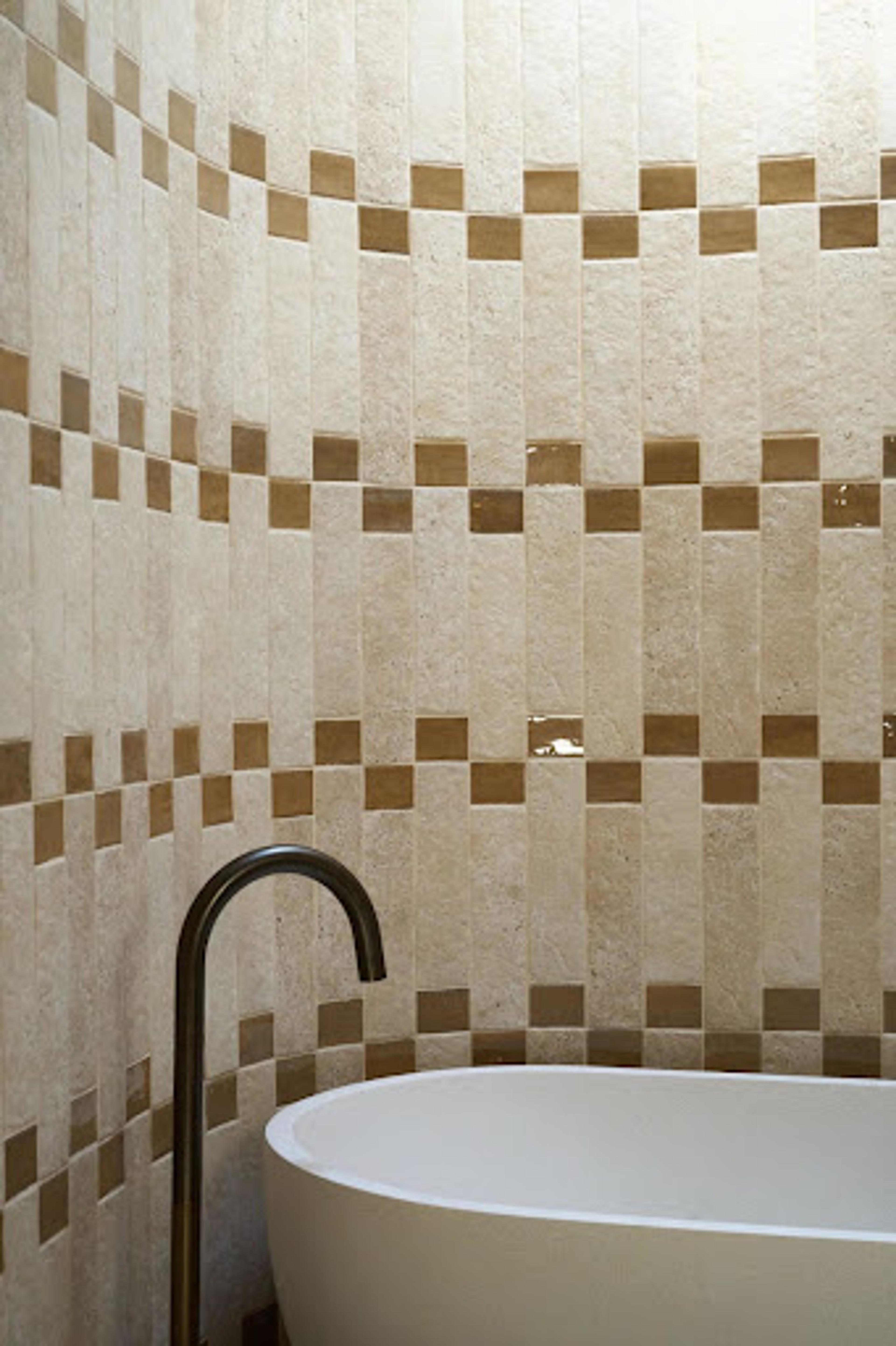 Yabby Antique Brass Tapware and Kirribilli Sand Travertine Look Tile