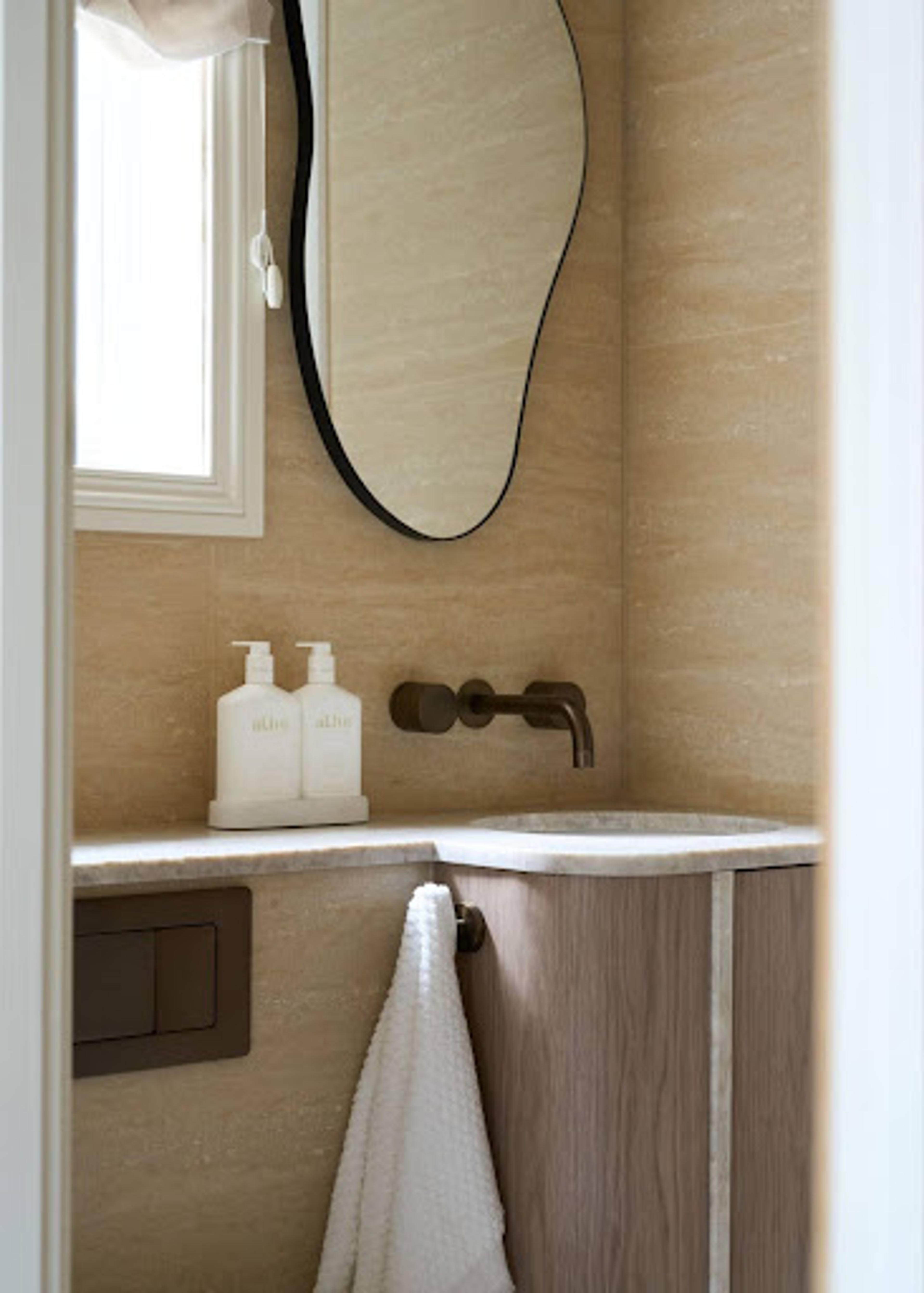 Bathrooms played a big role in the renovation, and Steph and Gian approached them with a clear focus on texture, tone and how the spaces would be used. TileCloud tiles bring depth and variation, with neutral colours leaning on texture rather than contrast to shape each room. Paired with Yabby antique brass tapware, the bathrooms feel warm and layered, sitting perfectly within the flow of the home.